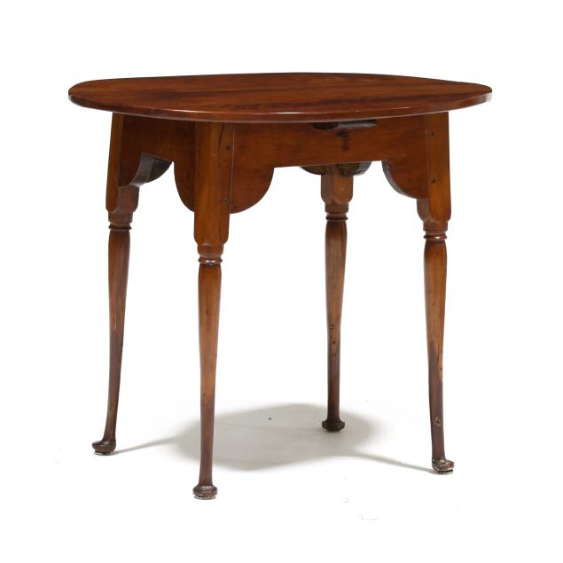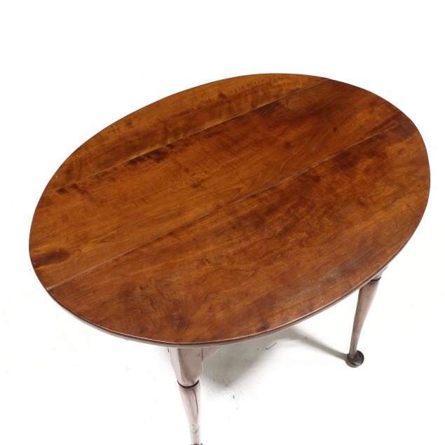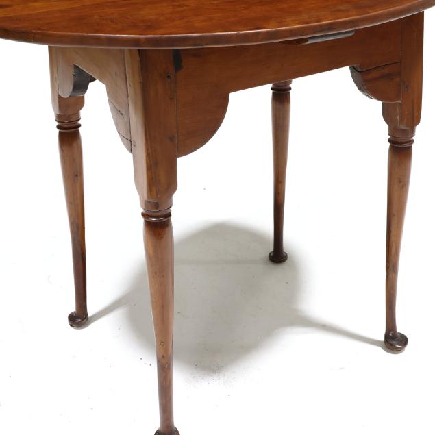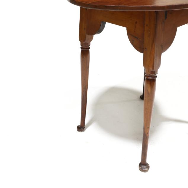Circa 1760, oval top, flush shaped skirts, turned tapered legs with pad feet.