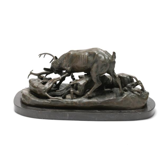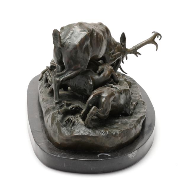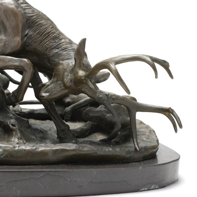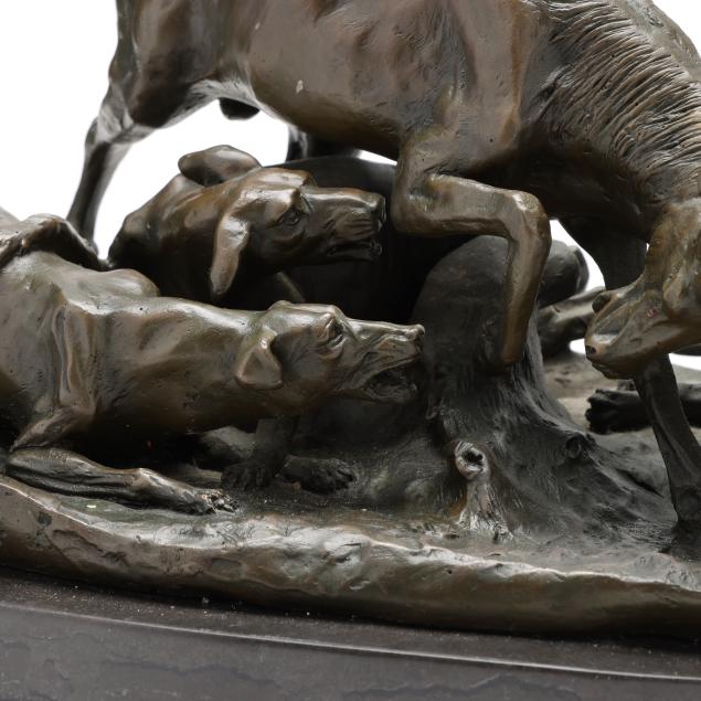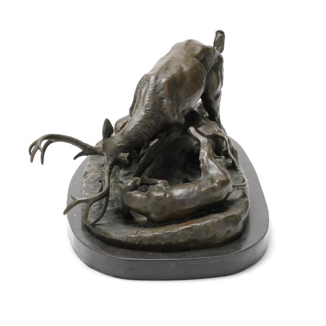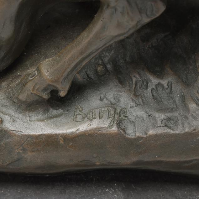 Second half 20th century, patinated bronze, signed "Barye" to the naturalistic terrace, mounted upon a conforming black stone base.