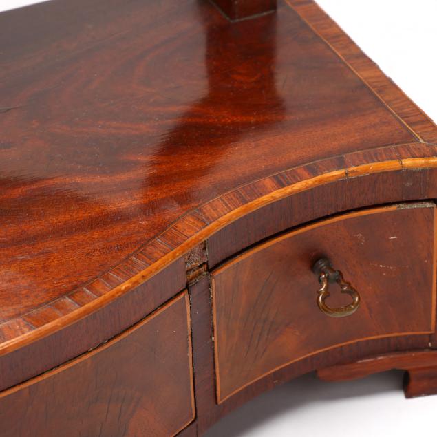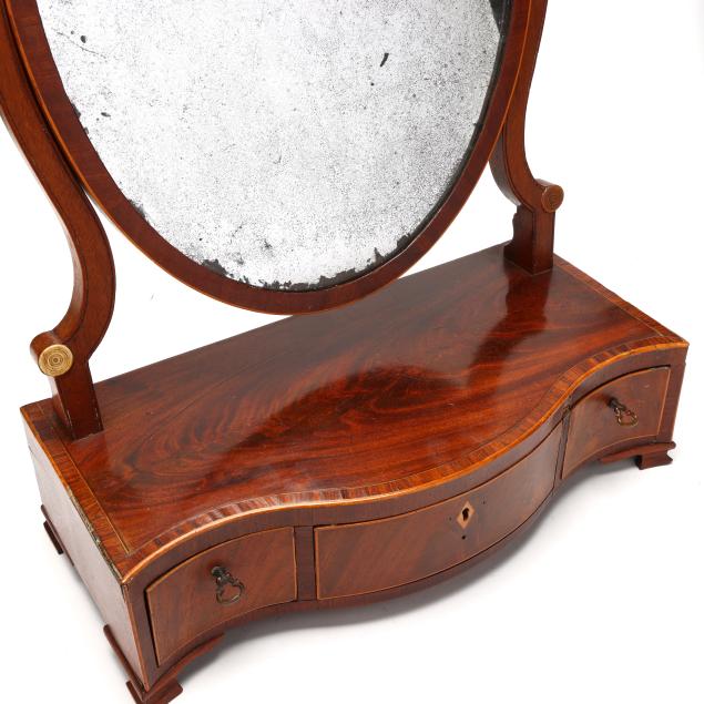 Late 18th century, mahogany veneer, deal secondary, oval mirror with light wood line inlay to the edge of the frame, shaped stiles with mounted bone discs and scratch bead, serpentine case with three conforming drawers having banded inlays on ogee bracket feet.