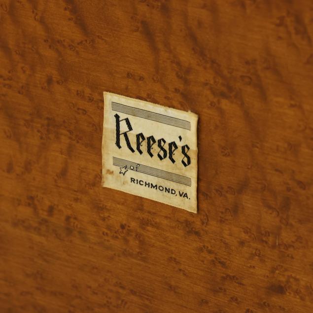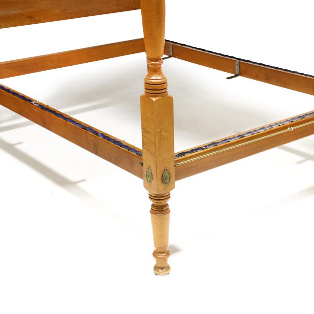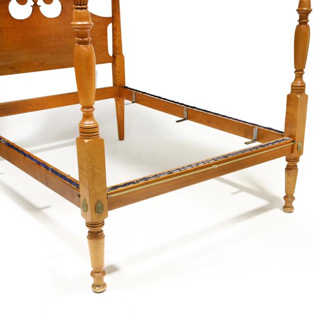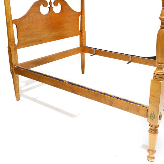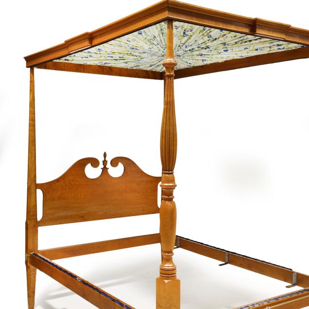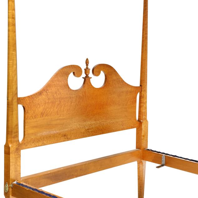 Richmond, Virginia, late 20th century, the wave-crest headboard in birds eye maple with central turned finial, figured maple pencil posts, the footboard with simple rail and turned and reeded posts, the tester with molded edge and projecting central block in figured maple, with wood rails, labeled.