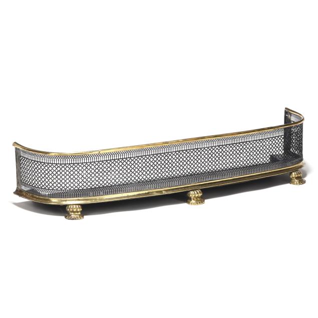 19th century, brass upper and base moldings, surrounding a pierced screen with arched and quatrefoil patterns, raised on three stylized paw feet.