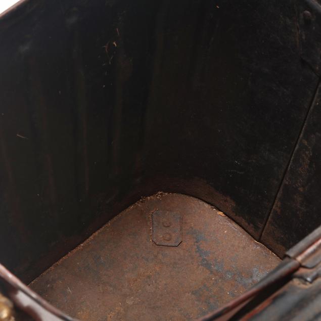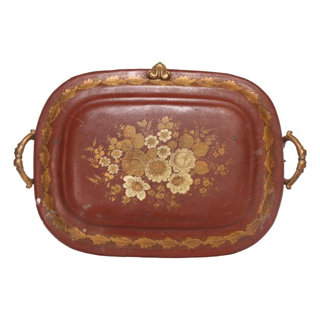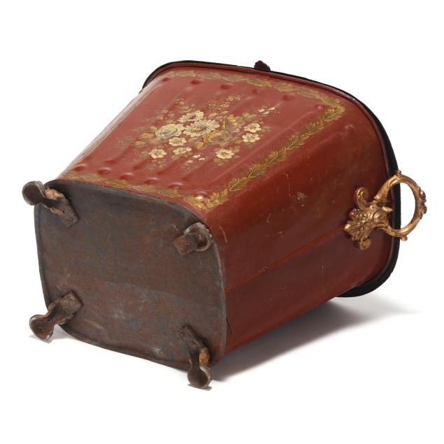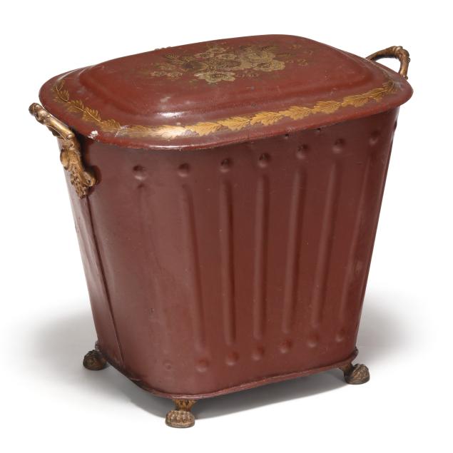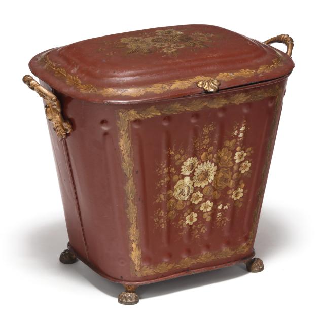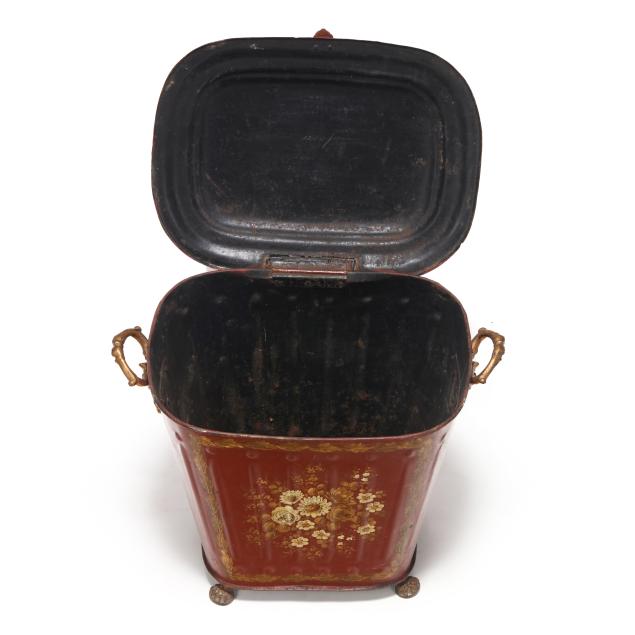 Late 19th century, red field with gold and white stenciled decoration, applied gilt meal handles and paw feet, hinged lid.