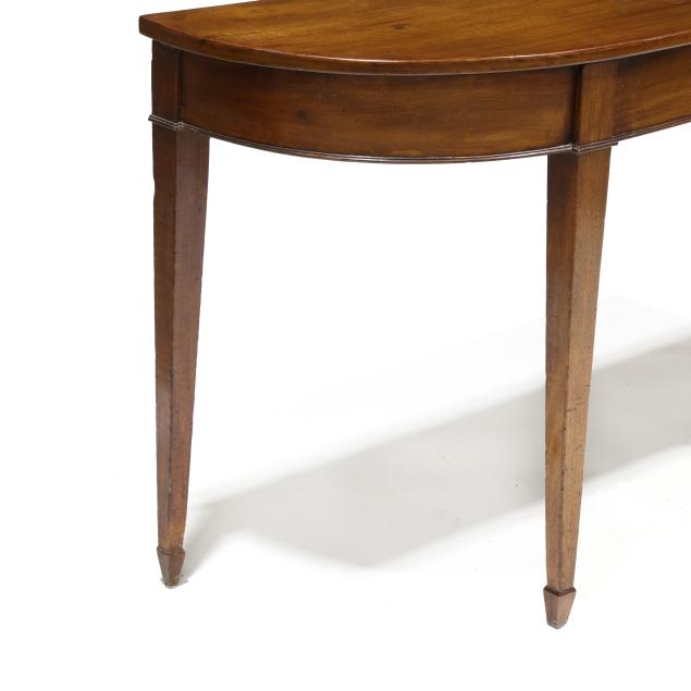 Circa 1800, fruit wood secondary, D-shaped top, conforming skirt with applied cock beaded trim on straight tapered legs with spade feet.