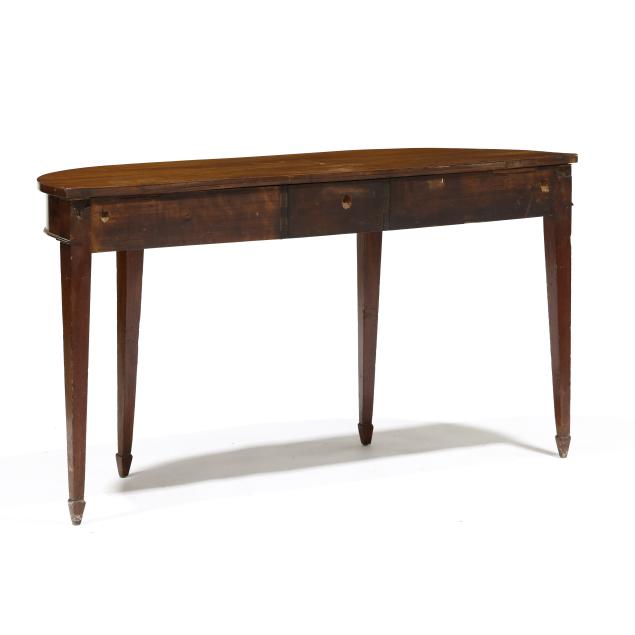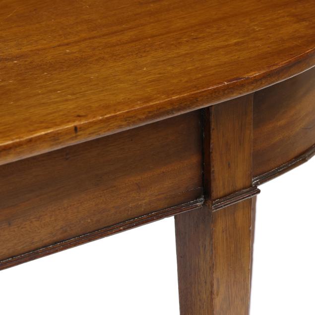 From the Estate of the late Peggy Augustus, Old Keswick, Virginia Once part of a banquet table, now with stabilized gate-legs; top with scratches and ring stains; underside with horizontal cuts to correct a warp; scuffs to the feet.