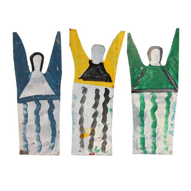 Late 20th century, paint on cut sheet metal, three figures with raised arms, all signed "R A Miller."