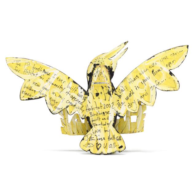 2002, polychrome painted carved wood bird house, inscribed with date, musings, and signature to verso.