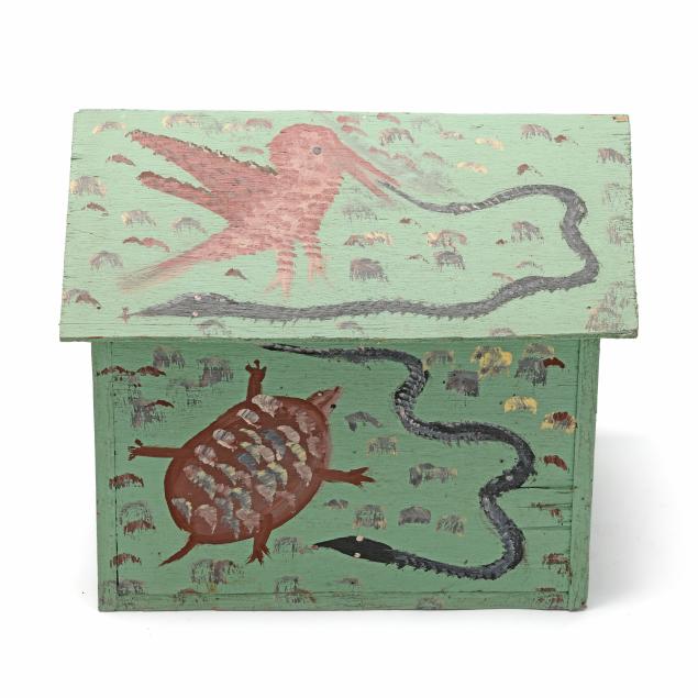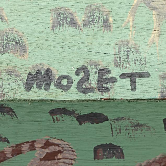 From the Estate of the late Susan C. Frankenberg, Hillsborough, North Carolina Mose Tolliver was born to sharecroppers near Montgomery, Alabama. After a severe injury in the late 1960s, he turned to painting as a means to combat boredom and pain. Tolliver's work has been exhibited in the Smithsonian American Art Museum, Washington, D.C., the Metropolitan Museum of Art, New York, the American Folk Art Museum, New York, and the Montgomery Museum of Fine Arts, Montgomery, Alabama.