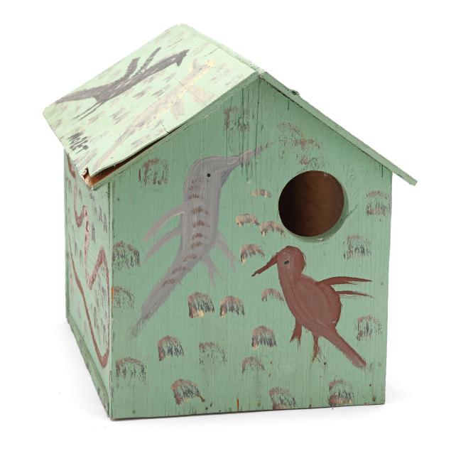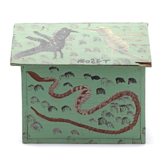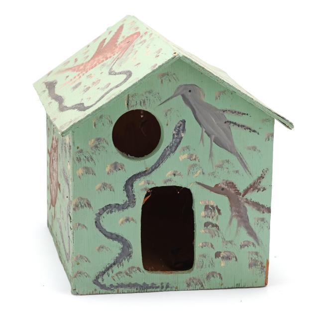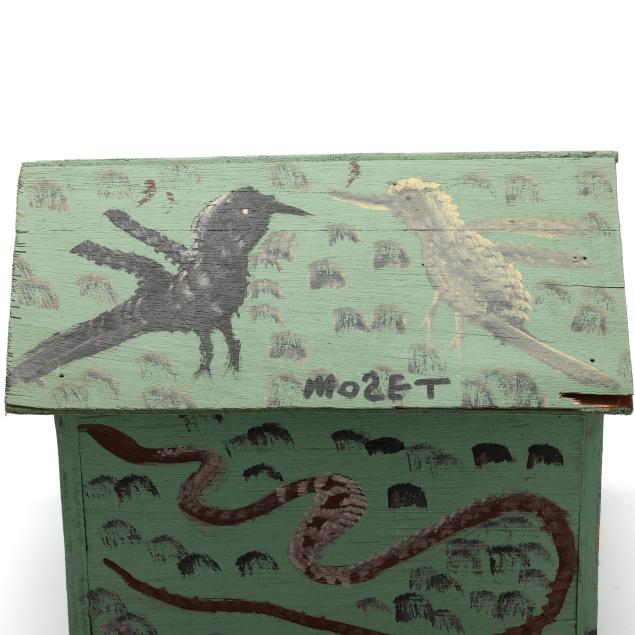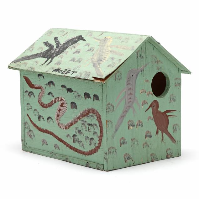 Late 20th century, polychrome painted cut wood bird house with mint green ground, decorated with birds, snakes, and turtle, signed "MOSET" to roof.