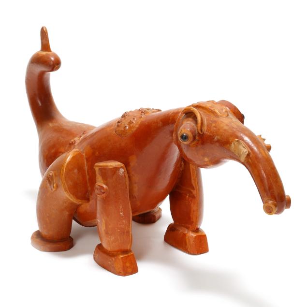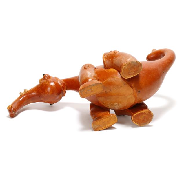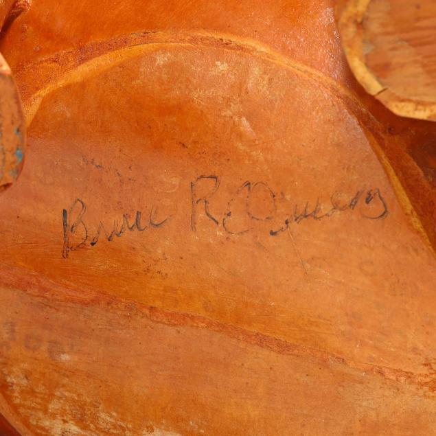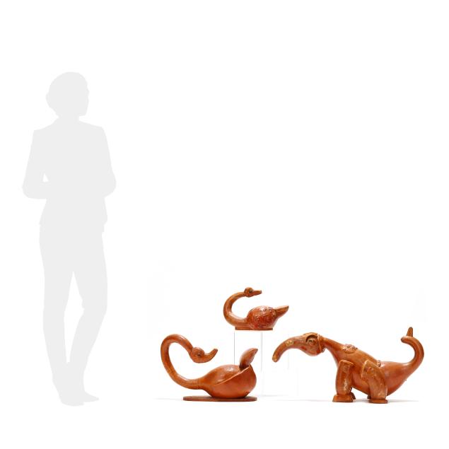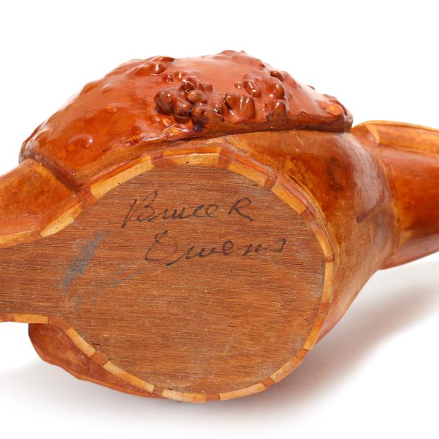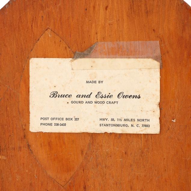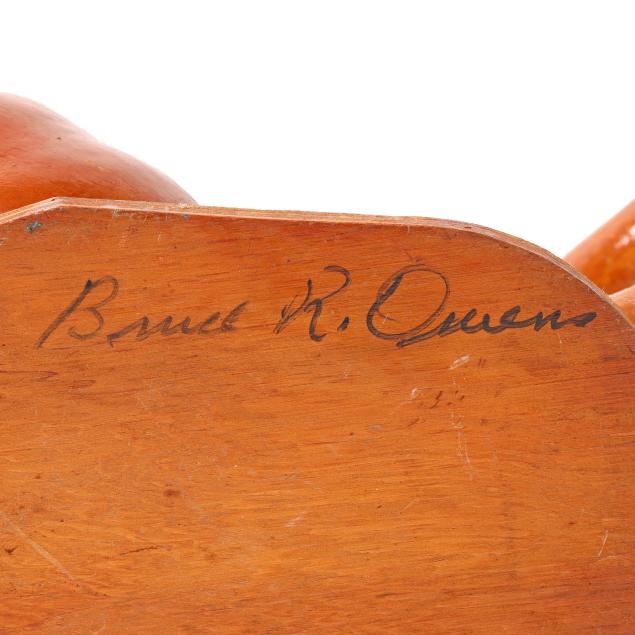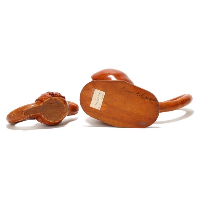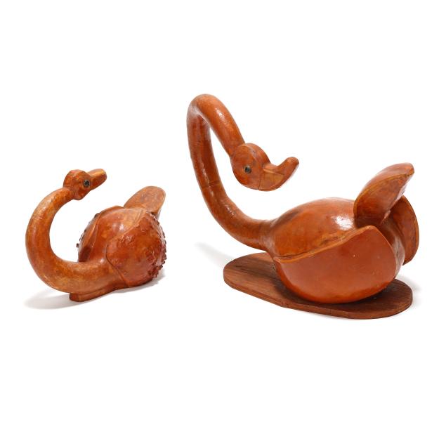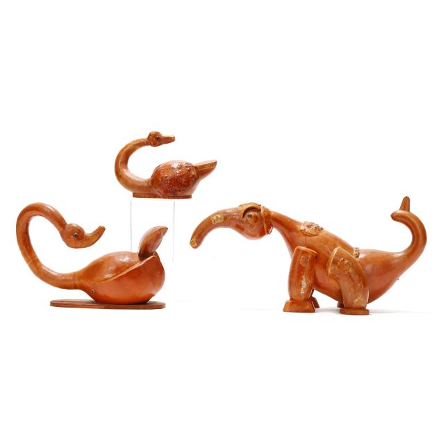 Late 20th century, carved and assembled gourd and wood with applied eyes including (2) swans and a dinosaur, each signed "Bruce R. Owens" to underside, the larger swan with business card for Bruce and Essie Owens Gourd and Wood Craft from Stantonsburg, NC.