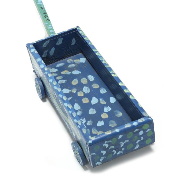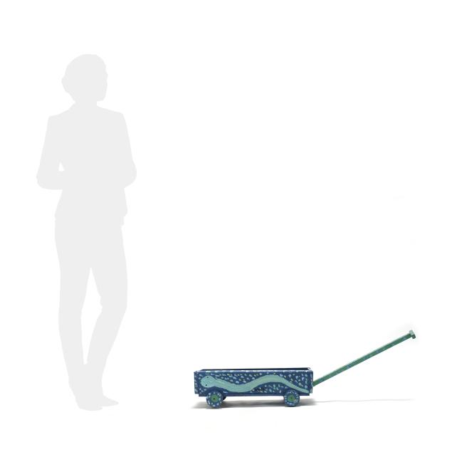 Late 20th century, polychrome painted cut and assembled wood wagon with snake decoration, signed "MOSET" to pull and side of wagon.