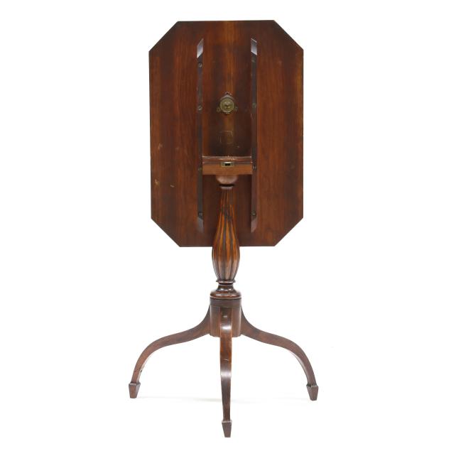Attributed to Massachusetts, circa 1790-1810, rectangular top with cut corners, central elliptical satinwood inlay within book-matched oval flamed veneer, underside battens, block support, well turned and reeded standard, tripod base, edge of standard with notch, tall spider legs with spade foot. Accompanying the Lot is a copy of the purchase receipt from Gooseneck Antiques in 1970.