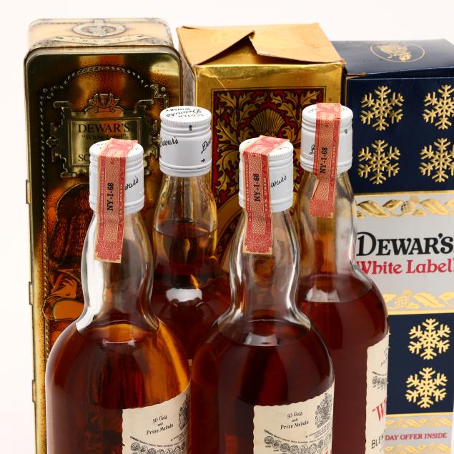 NV, Dewar's White Label Blended Scotch Whisky, John Dewar & Sons Ltd., Perth, Scotland, 43.4%, thought to be early-to-mid 1980s bottling, 3 into neck, 3 sealed, includes 1ocb & 1 original metal tin (3 4/5 Quart)