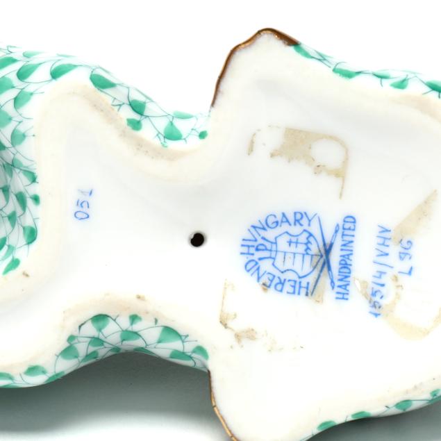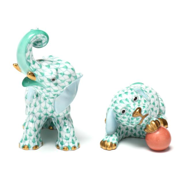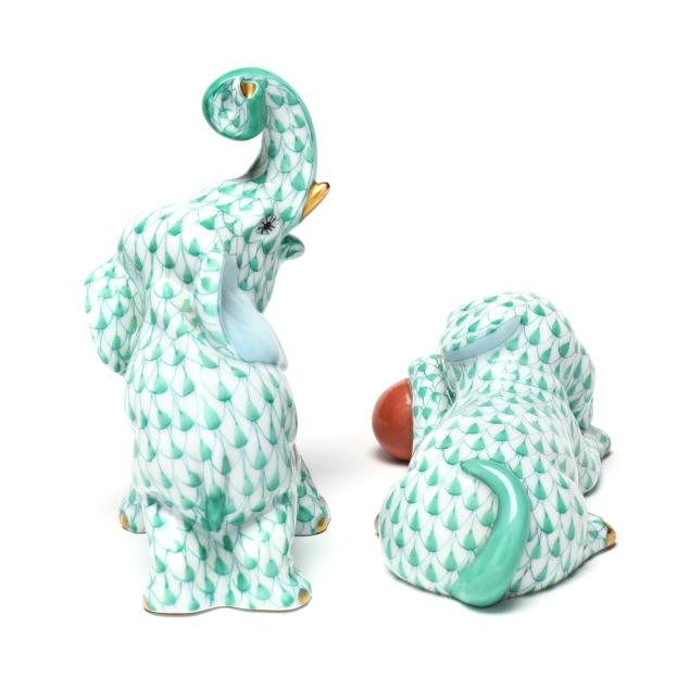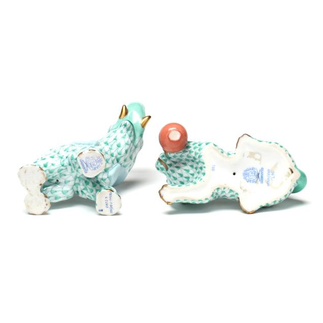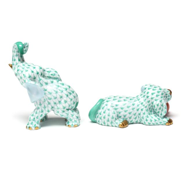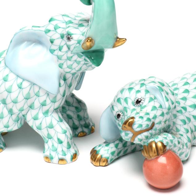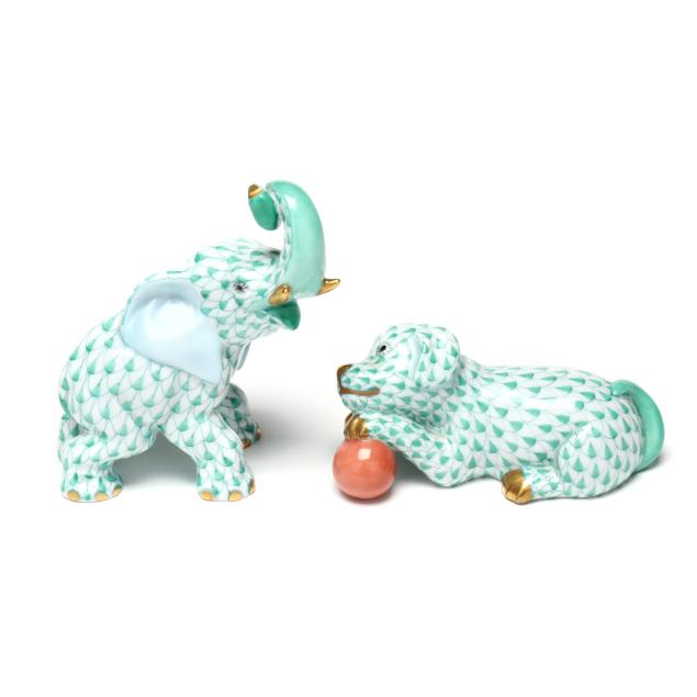 Hungary, hand-painted and gilt porcelain, to include a #15266 joyful elephant; and a #15514 puppy with ball, both marked with company backstamp to underside.