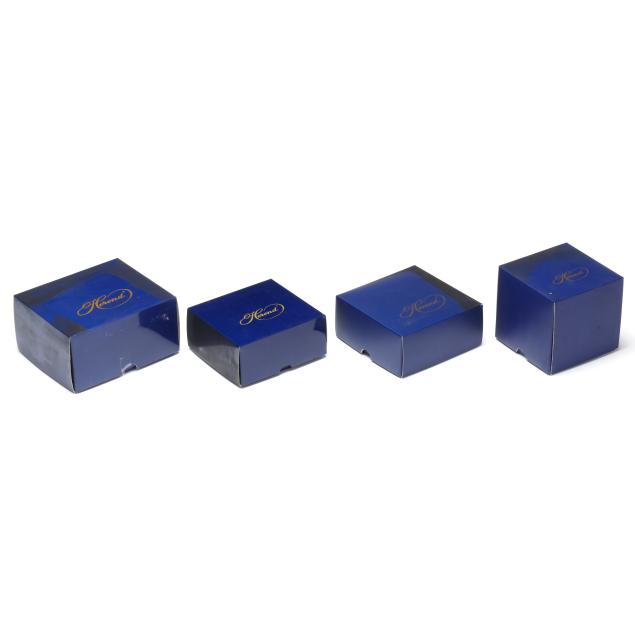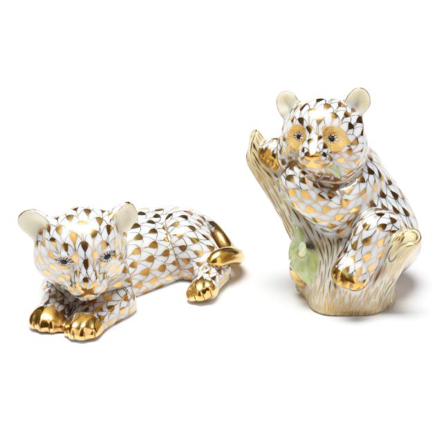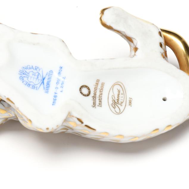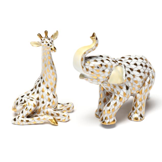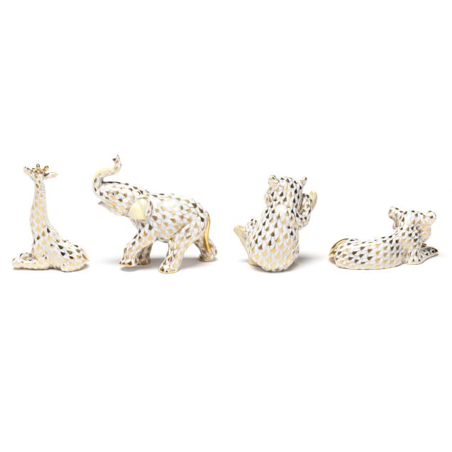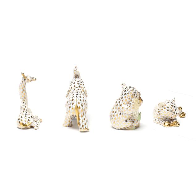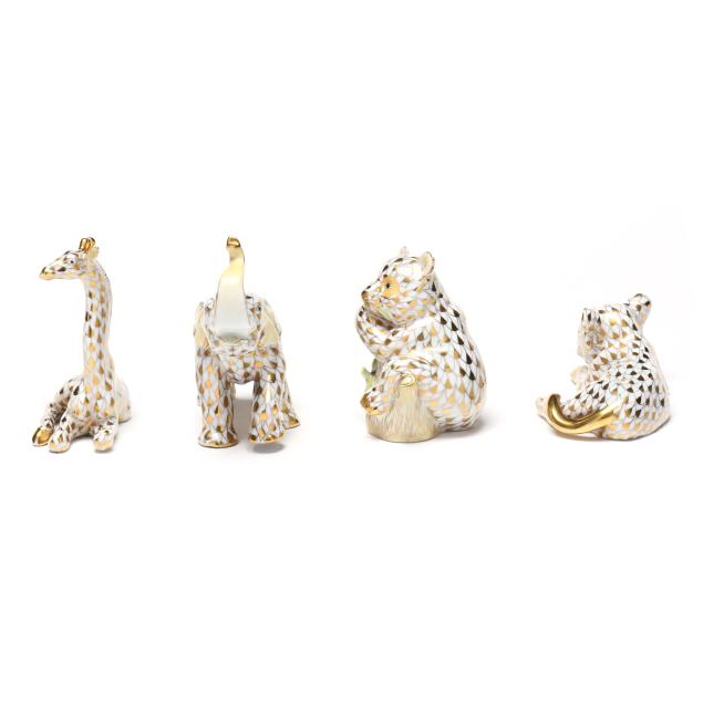 Hungary, hand-painted and gilt porcelain, to include a 1999 #15471 seated giraffe; a 2001 #15488 elephant with 175th anniversary and Smithsonian Institution marks; a 2003 #15687 seated tiger cub with Smithsonian Institution mark; and a 2002 #15672 panda cub with Smithsonian Institution mark, all with company backstamps to underside and presented in original boxes.