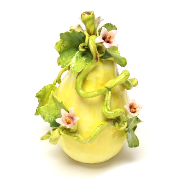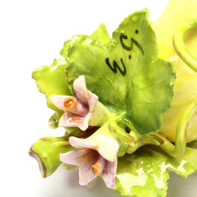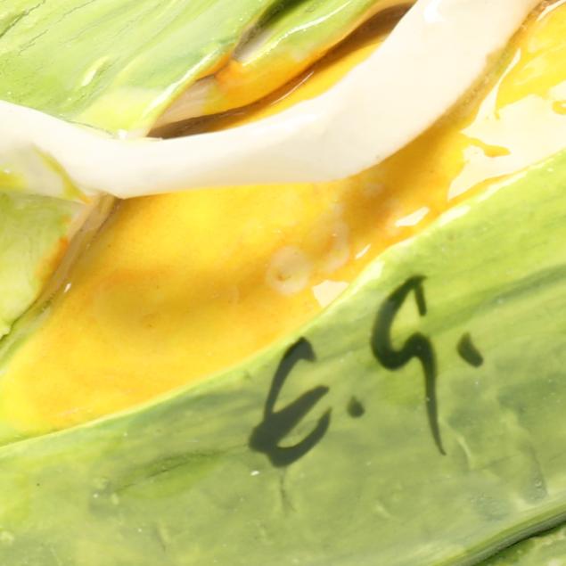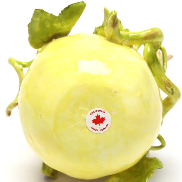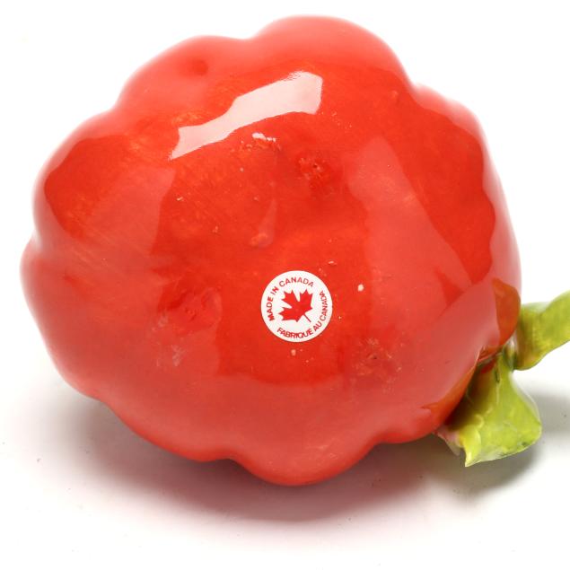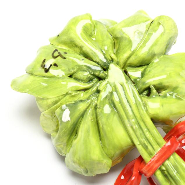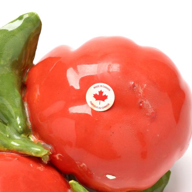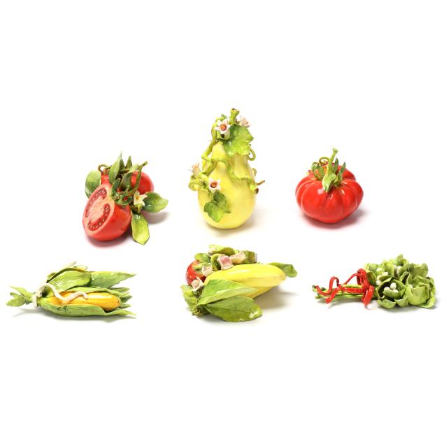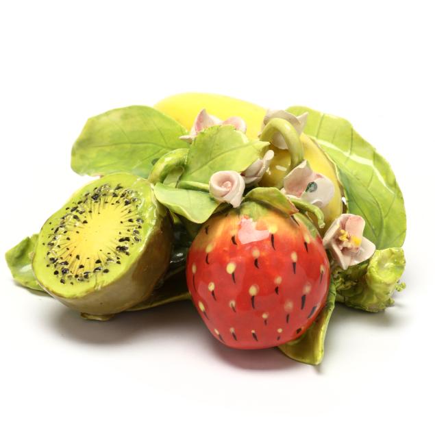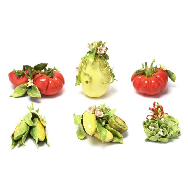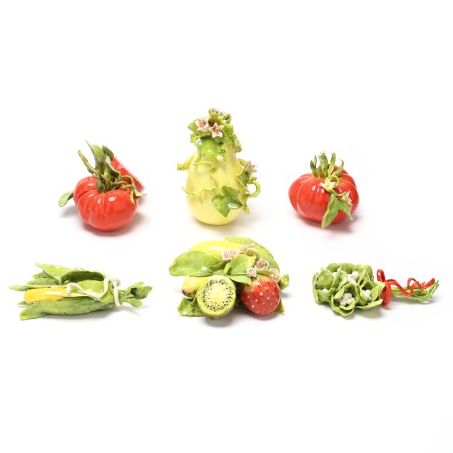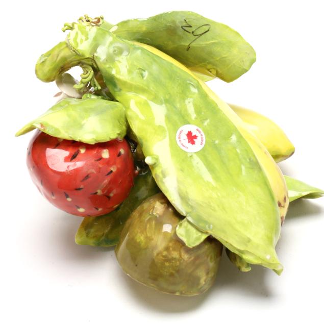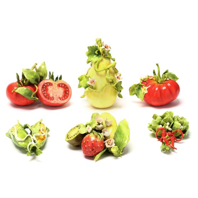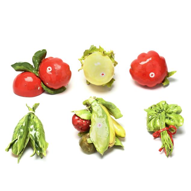 Canada, contemporary hand-painted porcelain fruit and vegetable groupings adorned with ribbons and blossoms, all signed "EG" and some with "MADE IN CANADA" label.