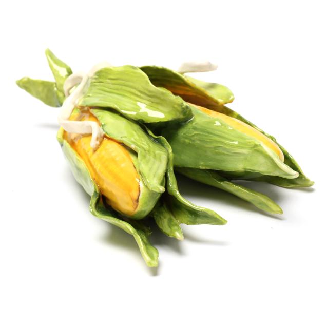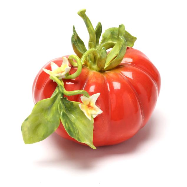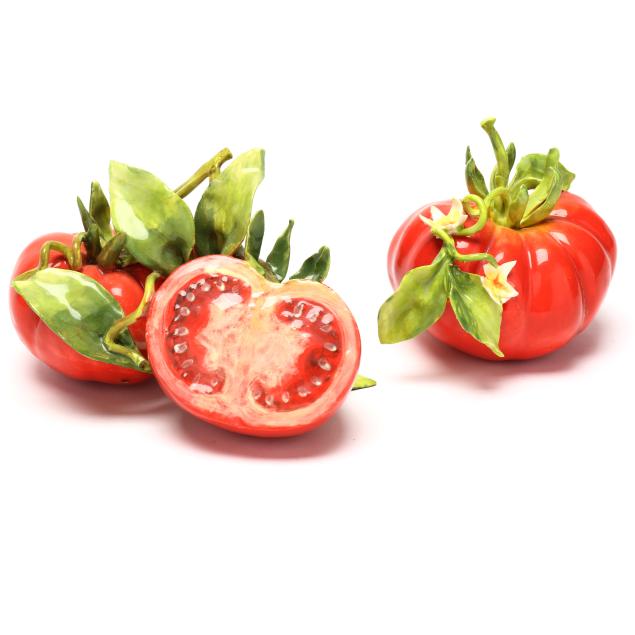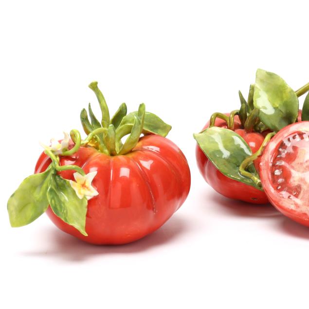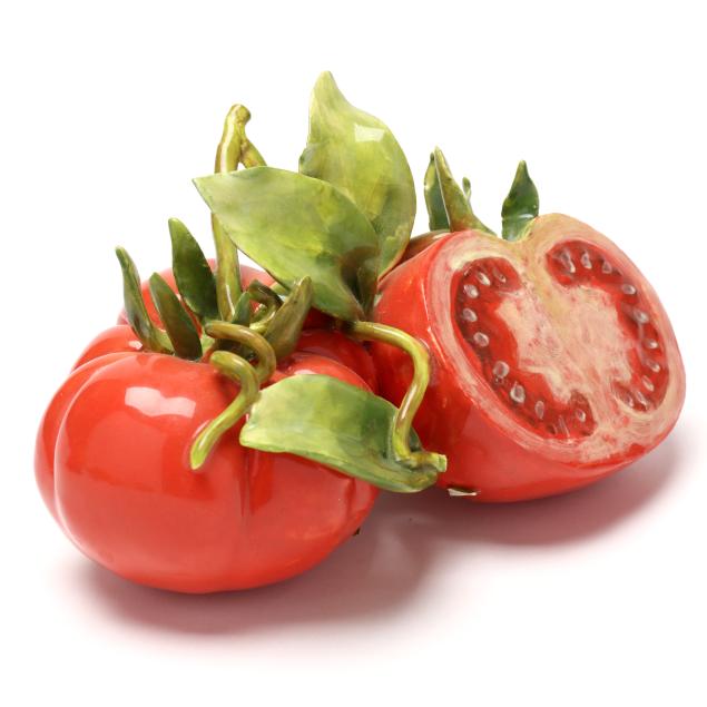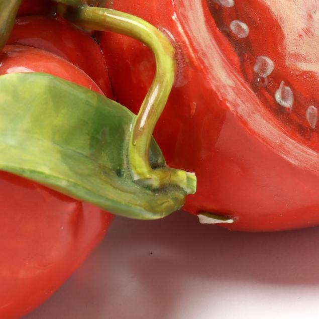 Pear with small losses to one leaf and petal; pair of tomatoes with break and repair to one tomato and small loss to vine at base; sole tomato with fleabites to blossoms; fleabites to a few leaves on large fruit grouping, corn husks, and mistletoe bunch.