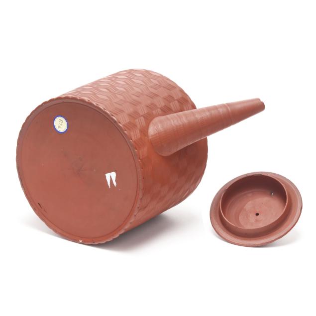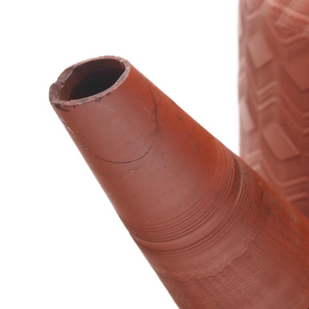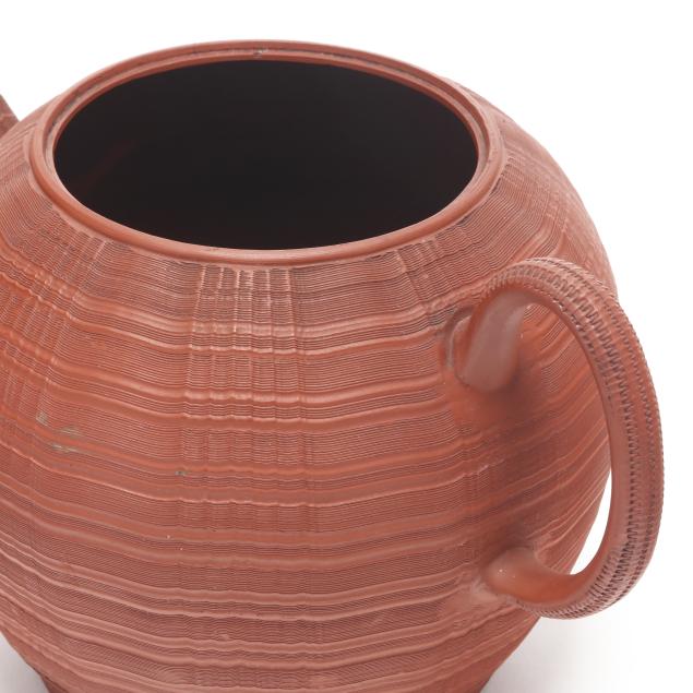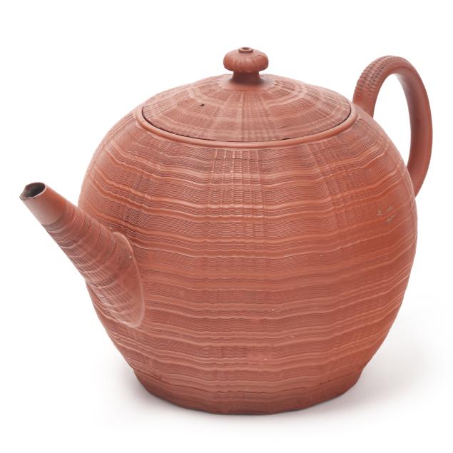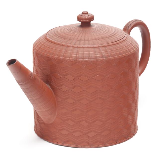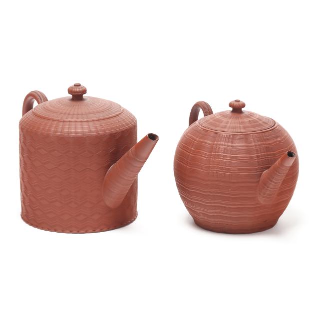 England, circa 1760-1770s, unglazed redware, both featuring fine engine turned wave decoration to the body, spout, and lid, with a matching coggled pattern to the applied handle, the larger of cylindrical form (8 x 12 1/2 x 7 in.); the shorter of bulbous form impressed key character mark to the pot underside (7 x 11 3/4 x 7 in.).