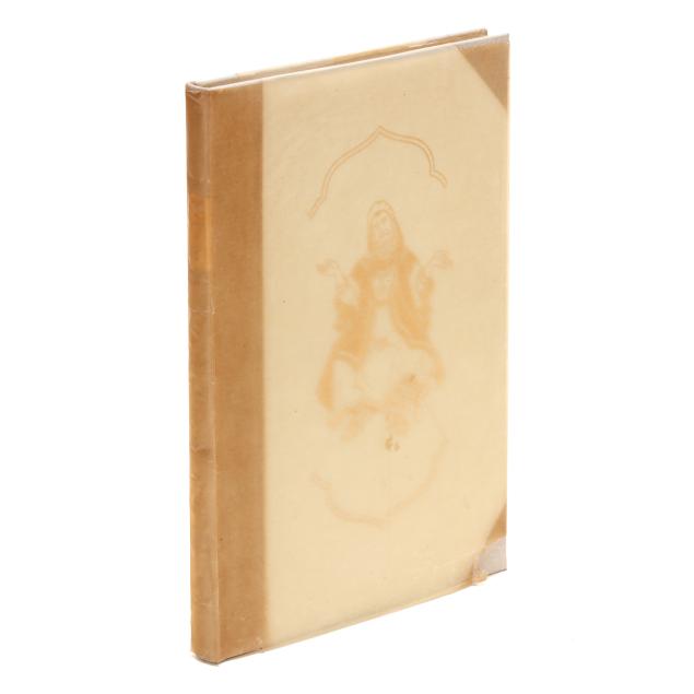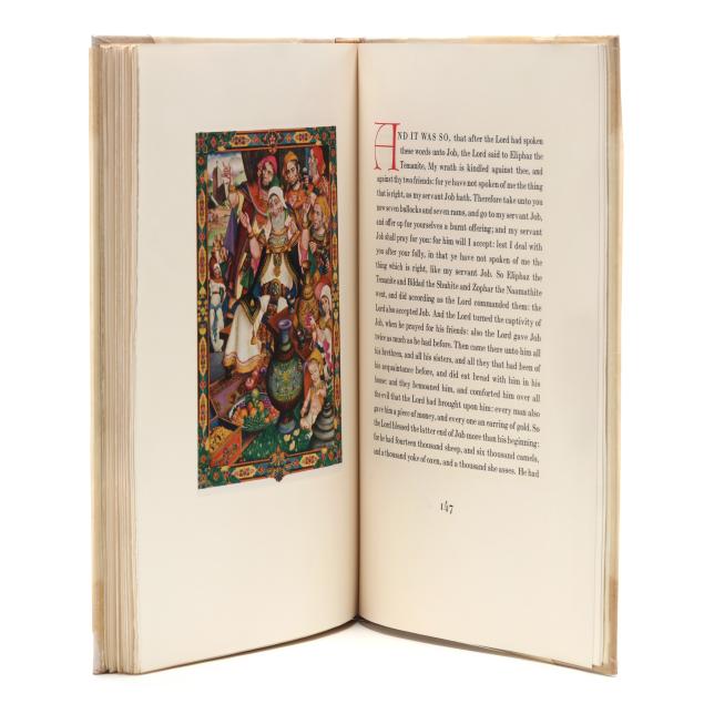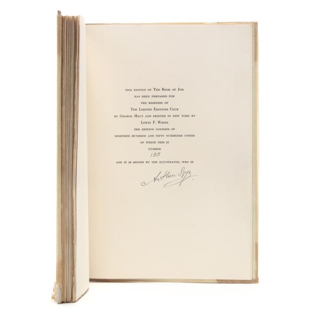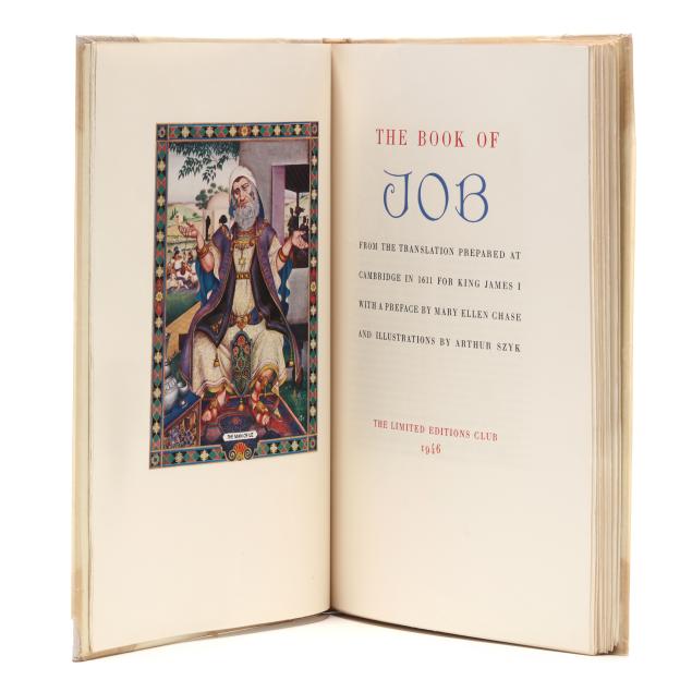 Arthur Szyk, illus. THE BOOK OF JOB. New York: The Limited Editions Club, 1946. Limited edition; no. 133 of 1950 numbered copies; signed by the illustrator on the colophon, as issued. Half white leather over gilt-decorated paper boards, gilt label on the spine and gilt top edge, in original glassine; housed in red felt-lined gold slipcase. 4to; 148pp. From the translation prepared at Cambridge in 1611 for King James I; with preface by Mary Ellen Chase, and mounted color plates. (Boards with some toning to paper, minor red marks from slipcase interior, and light rubbing to extremities; one page with a few small stains, one with finger grime, and one leaf with a small tear at lower margin, occasional additional light mark or minor handling wear but overall clean with some leaves still partially unopened; glassine with toning, chips, tears, and creases; slipcase with scuffing and wear to gold paper but very sturdy; very good/good.)