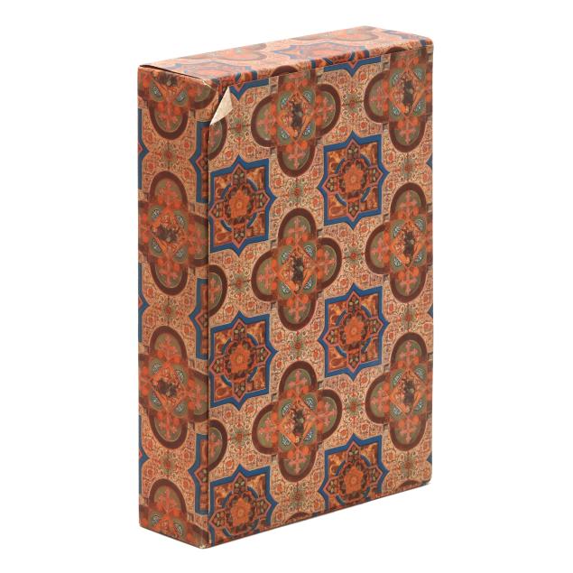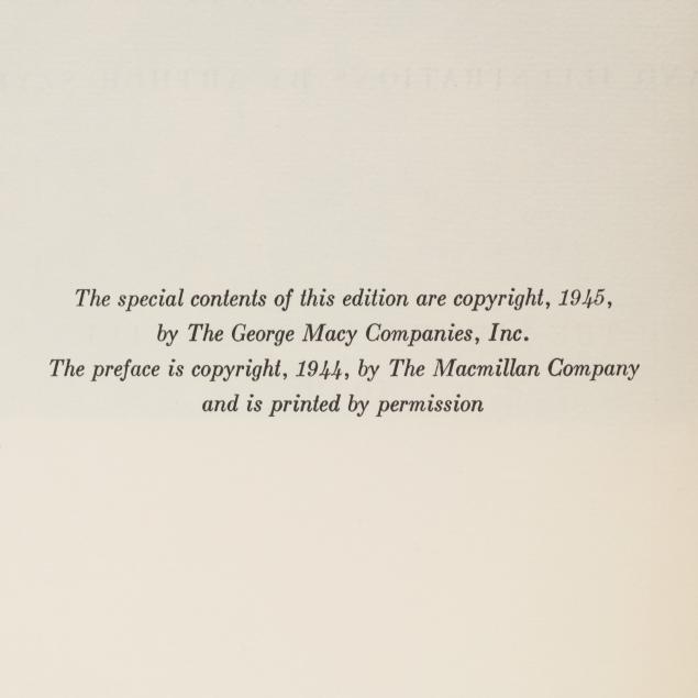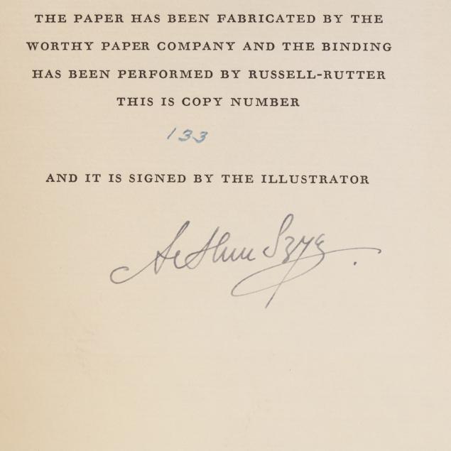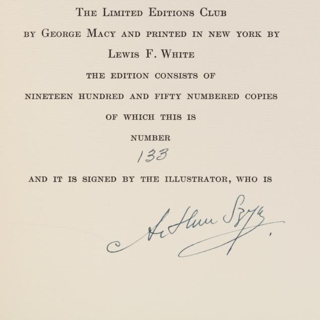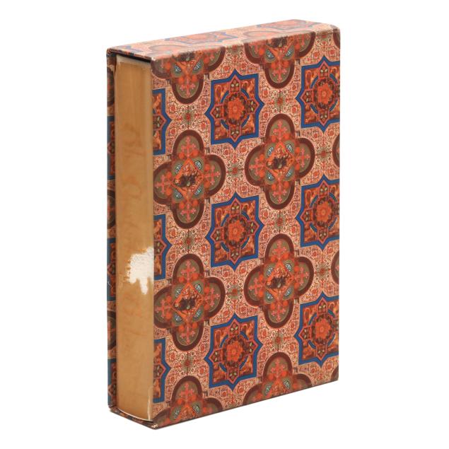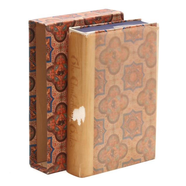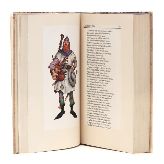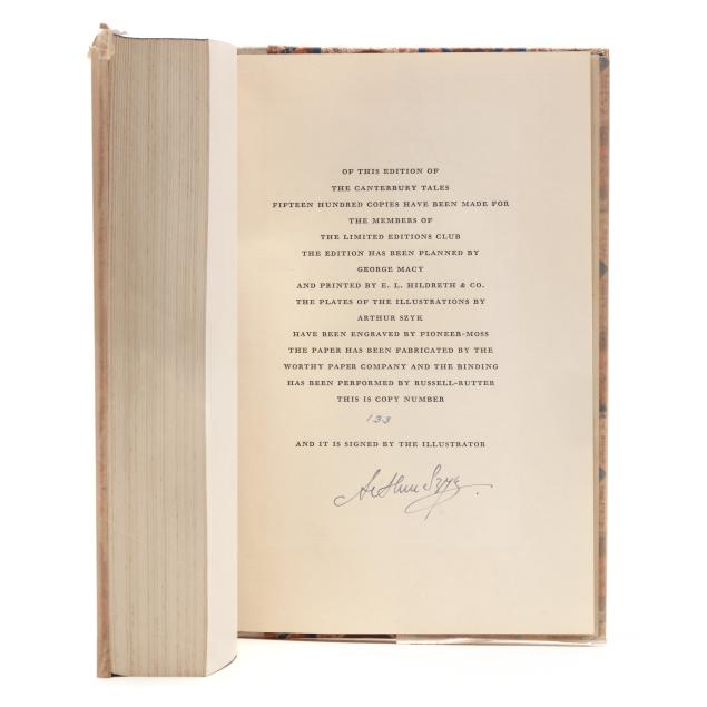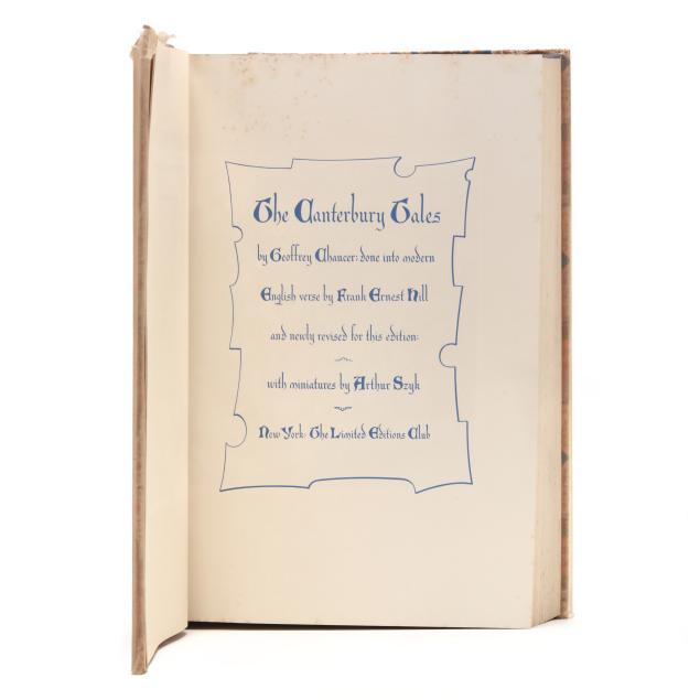 Geoffrey Chaucer; Arthur Szyk, illus.; Frank Ernest Hill, trans. THE CANTERBURY TALES. New York: The Limited Editions Club, [1946]. Limited edition; no. 133 of 1500 copies; signed by the illustrator on the colophon, as issued. White leather-backed patterned cloth-covered boards with gilt-lettered spine and stained top edge, in original glassine; housed in matching patterned slipcase. 4to; xx, 550pp. (Boards with minor edge rubbing, one corner slightly bumped, and light wear to spine ends including tail bumped; interior with occasional light foxing with heaviest at leaf edges and spotting to title page, infrequent small stains or marks, and offsetting from plates, with pages overall clean; wear to glassine including toning, faint spotting, edges with tears and chips, and area of loss at spine; slipcase with mostly light wear to corners with one area with paper lifting; very good in like slipcase.)