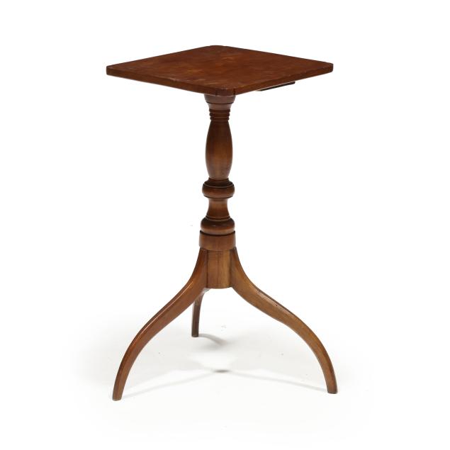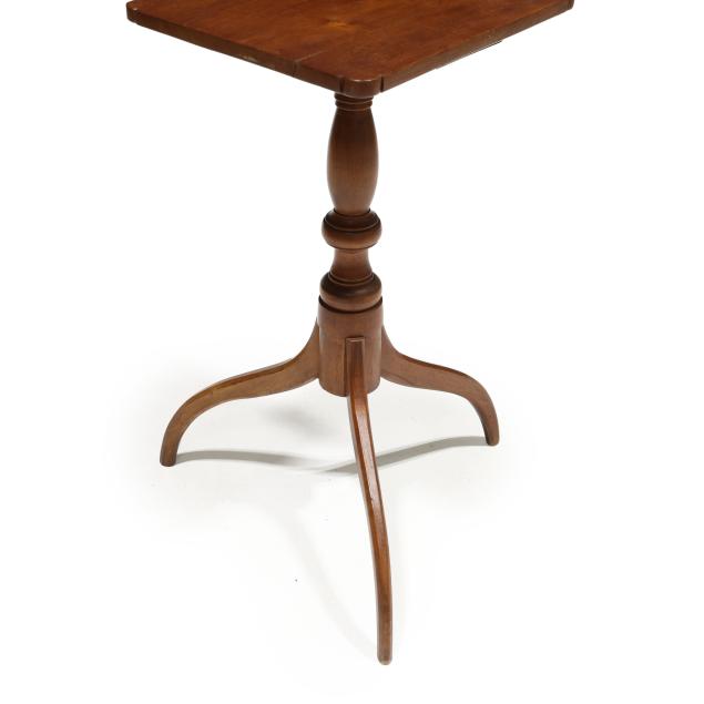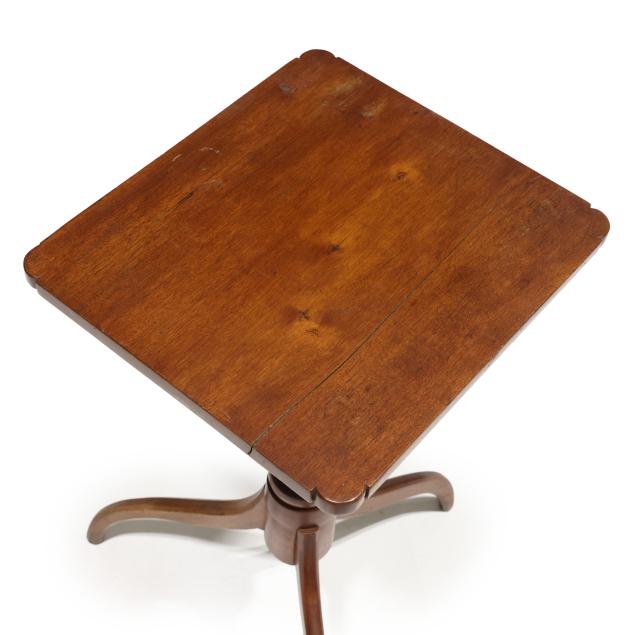 Circa 1800, mahogany secondary, rectangular one board top with porringer cut corners, baluster and ring turned standard, tripod base with spider legs featuring chamfered corners.