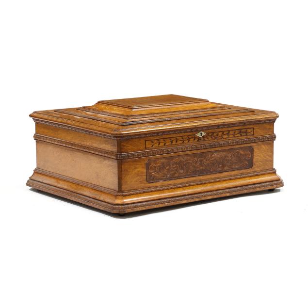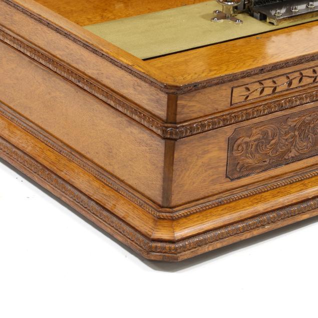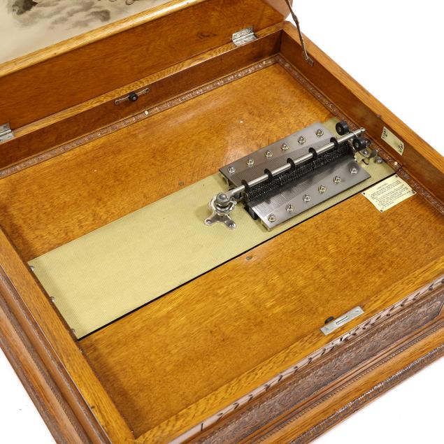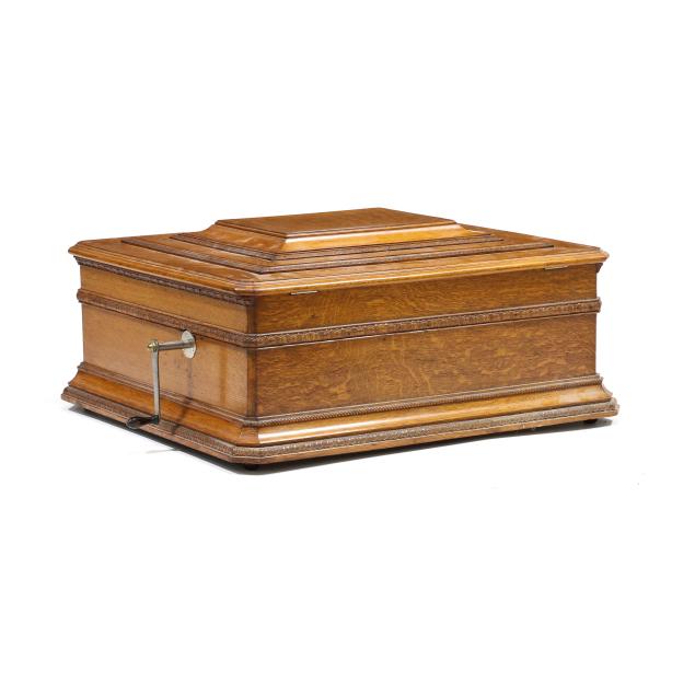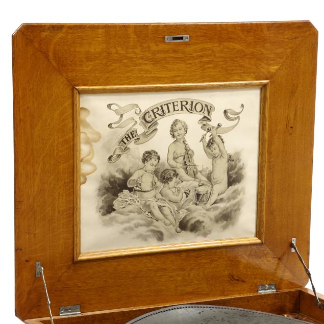 early 20th century, dual comb instrument within a rectangular tiger oak case with carved Neoclassical scrolled pattern friezes and moldings, brass mounted key with escutcheon and side crank handle, the hinged lid opens to a lithographic print of four musical putti, beneath the signature banner "THE CRITERION." Included with the lot is a case key and collection of (16) 20 1/2-inch discs.