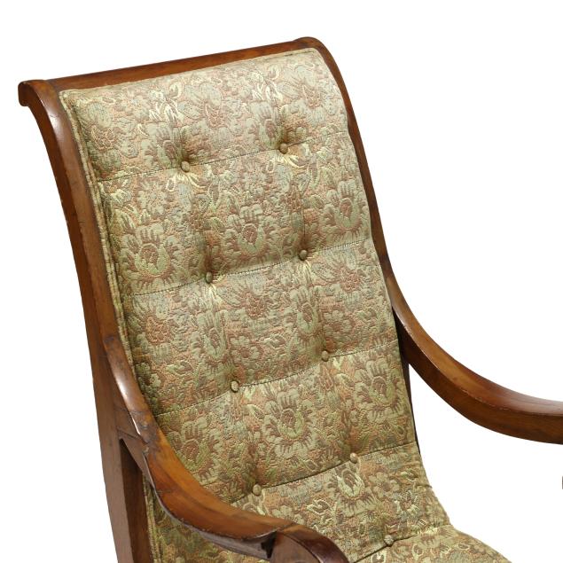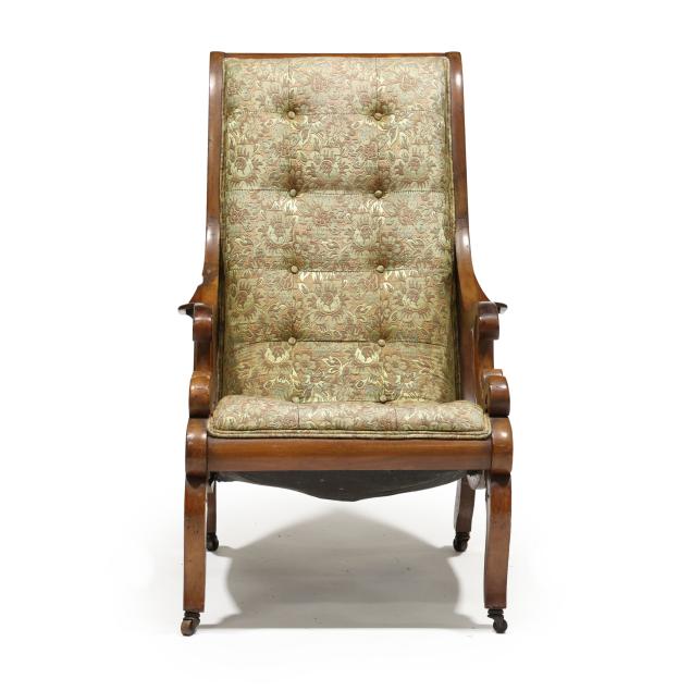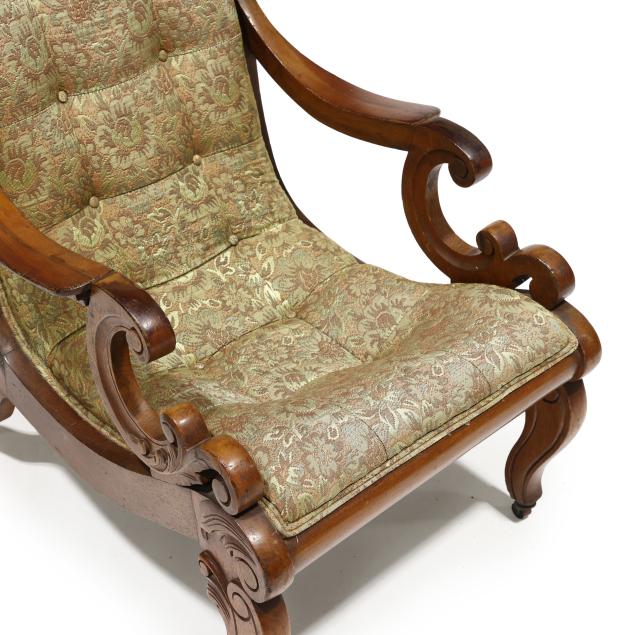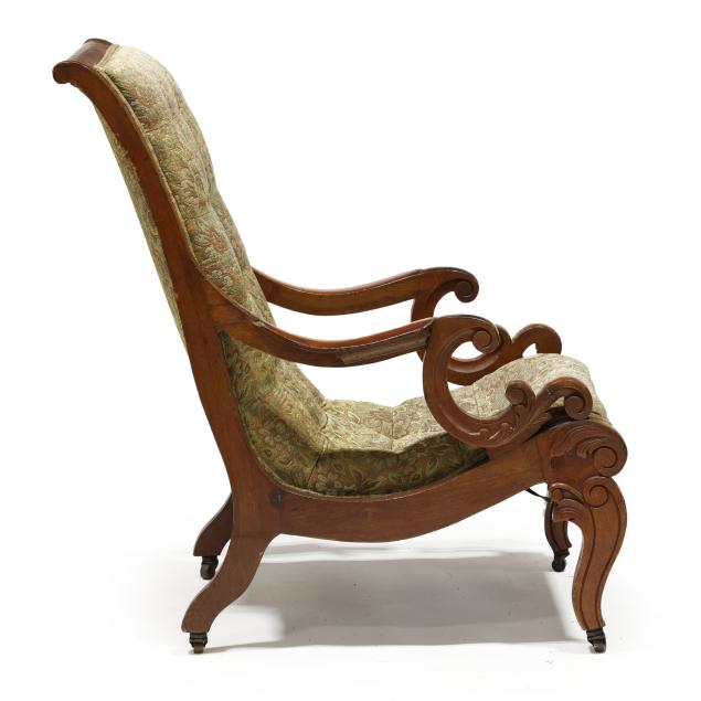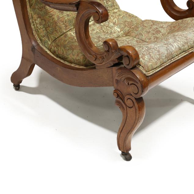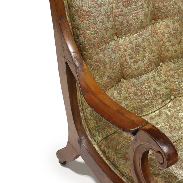 Caswell County, circa 1830, scrolled crest rail, shaped arms with C-scroll supports, later tufted upholstery, front relief carved cabriole legs, on casters.