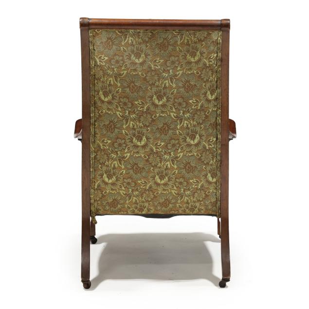 From the Estate of the late Susan C. Frankenberg, Hillsborough, North Carolina Later upholstery; walnut frame with sun fading and wear; small dent to upper right ear; both arms with repairs at stile joint (the left arm with some loss).