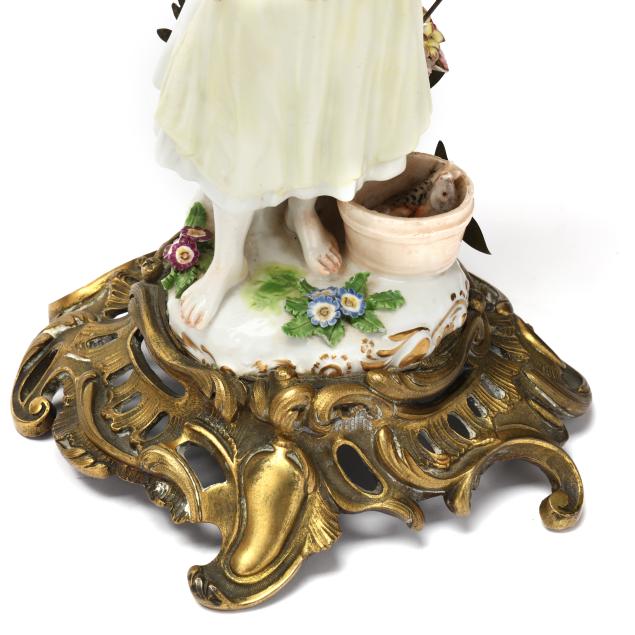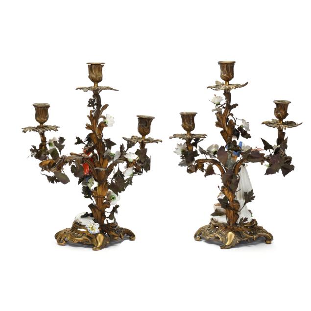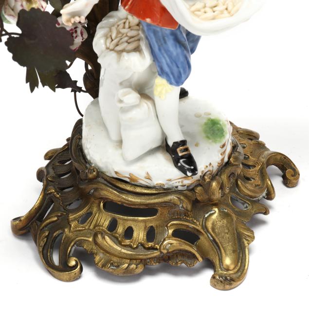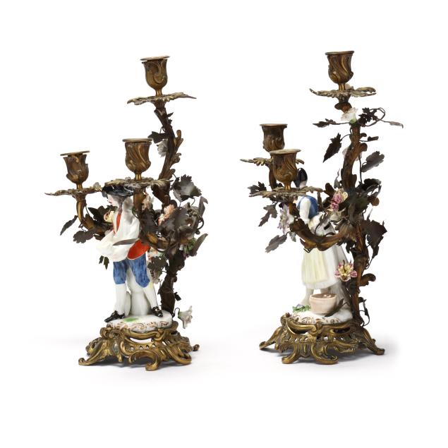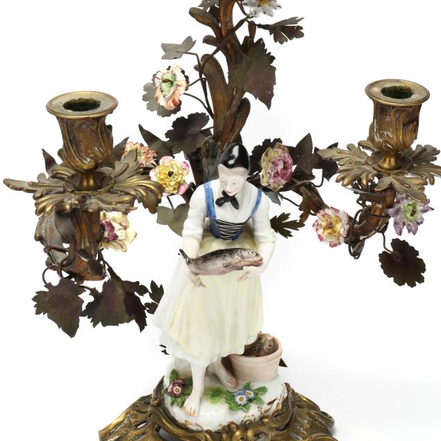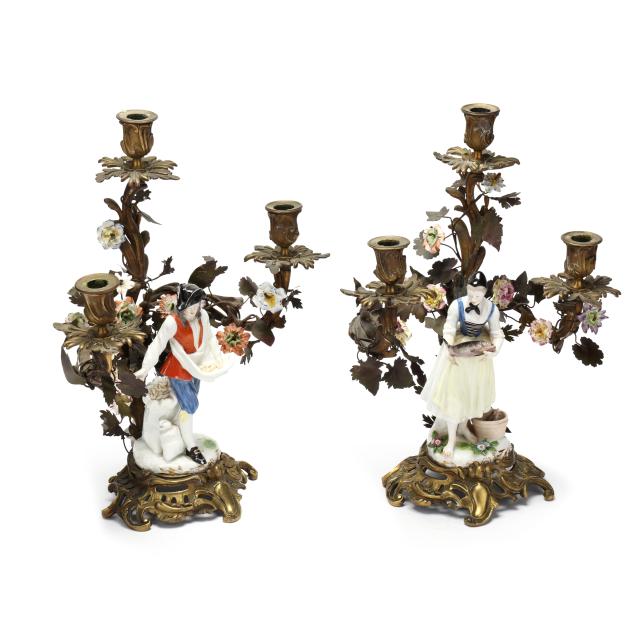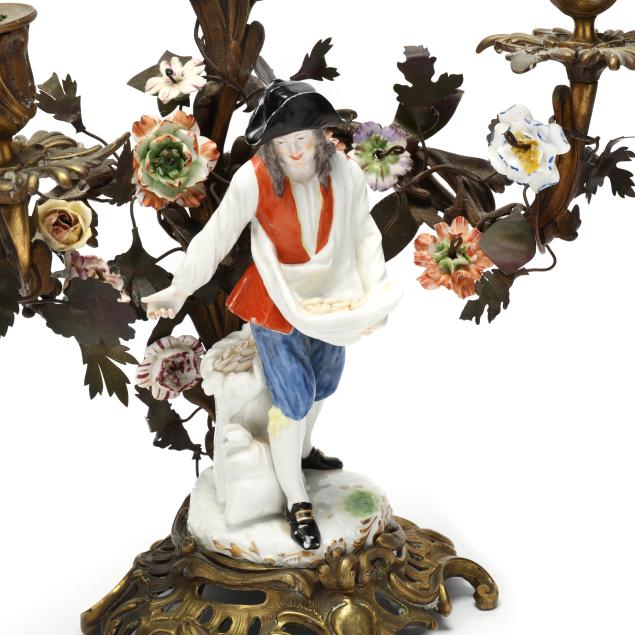 19th century or possibly earlier, porcelain figures of a Woman Selling Carp and Peasant Sowing Corn, after the mid-18th century Meissen models by Johann Joachim Kandler and Peter Reinicke, marked with gilt "D" to underside, each mounted within ormolu bronze three light candelabra, with tole vine stems terminating in painted porcelain flowers, cast rocaille capitals with foliate drip terraces and removable bobeches, all atop an ormolu pierced scrollwork base. This lot includes (6) tapered candles.