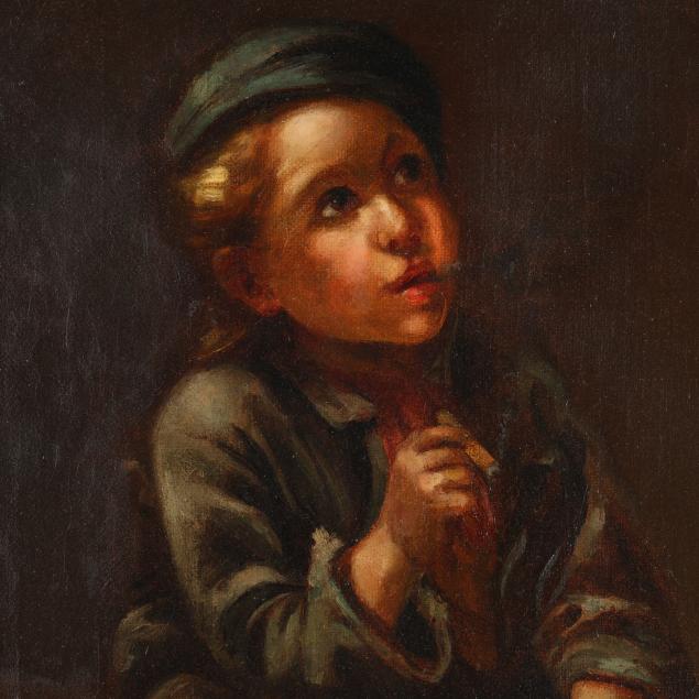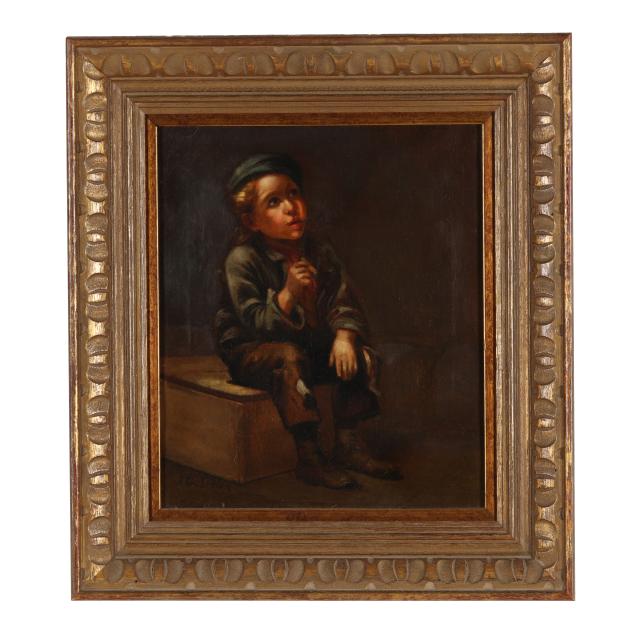 The painting offered here is one of Brown's most popular genres, the rough and tumble shoeshine boy. Brown grew up in poverty in England and was particularly sensitive to the lives of tens of thousands of children living on the streets of New York City in the 19th century. This young boy, with the red, white and blue fabric tatters by his feet and backwards kepi style cap on his head, may reference the orphans left behind in the aftermath of the Civil War.