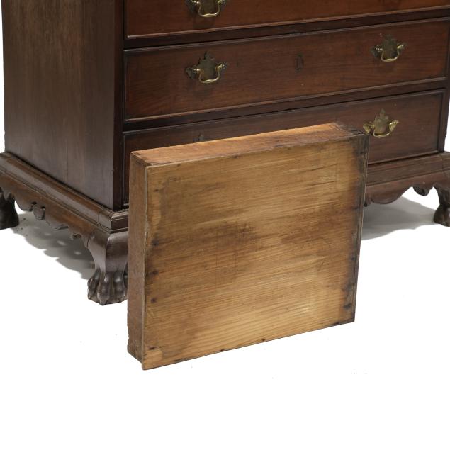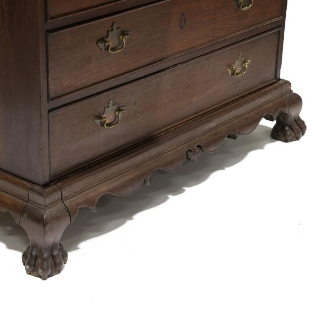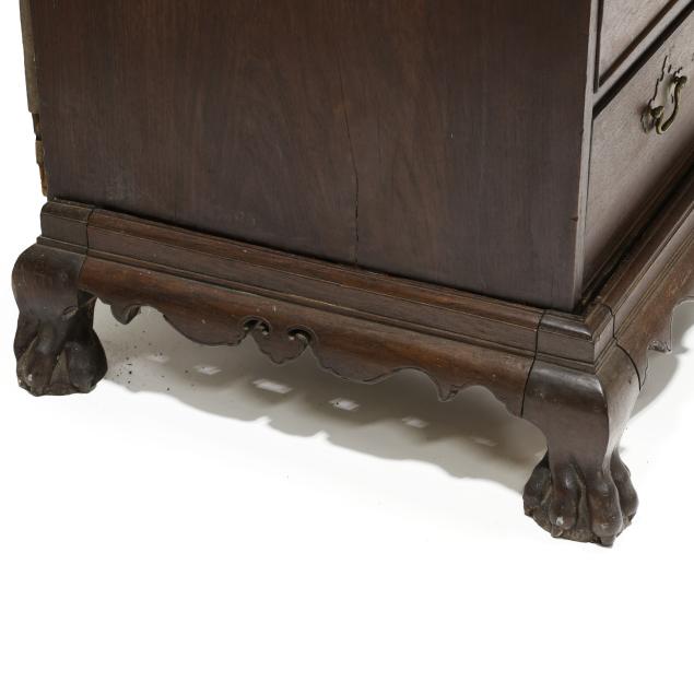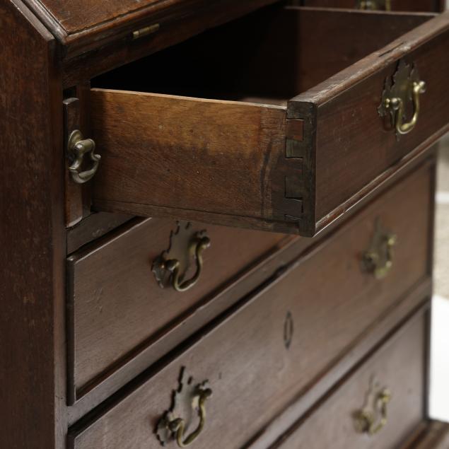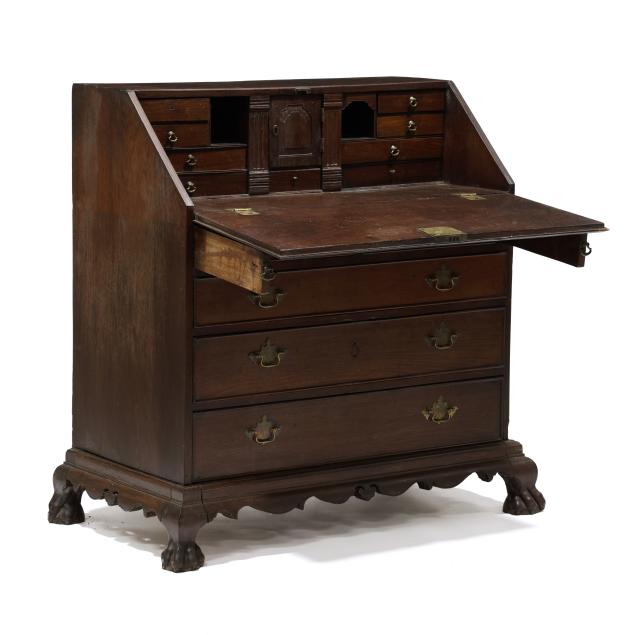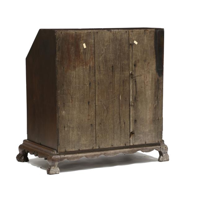 Early 19th century, two part form, possibly huanghuali, slant front with molded edge, well developed interior with central prospect door over one small drawer with a document drawer to the right, flanked by two pigeon holes with hidden valance drawers further flanked by four stacked drawers with reeded stile surrounds, the case with two over three graduated cock beaded drawers, set on a rectangular frame with scalloped skirt with scratch bead raised on short cabriole legs with ball and claw feet.