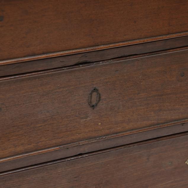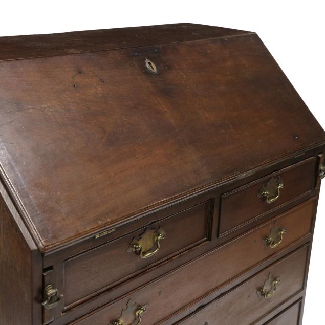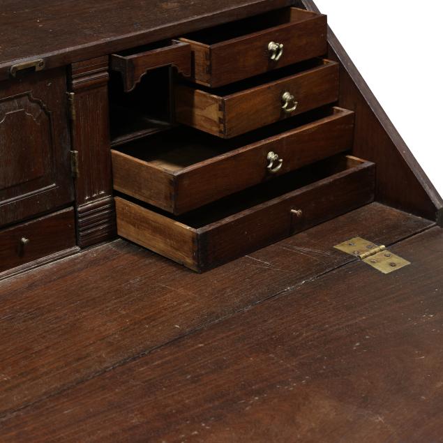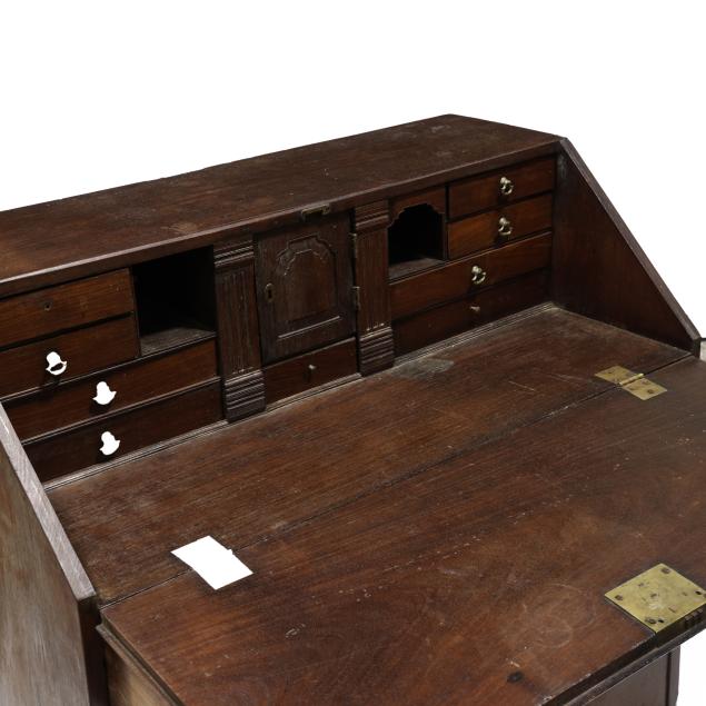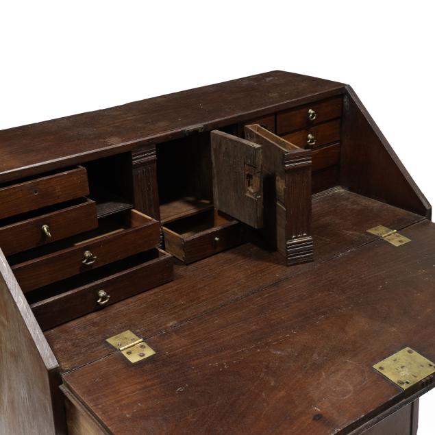 Old surface with some staining and inconsistencies; the slat lid with holes from previous mounts and area of wear to top edge; interior with left valance drawer guides missing causing the drawer to be loose; one missing interior pull; the left column document drawer is not moving - possibly a drawer but presently thought to be a stabilized faux column panel; drawers with later pulls and plugged locks; other imperfections commensurate with age.