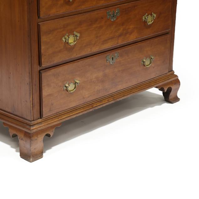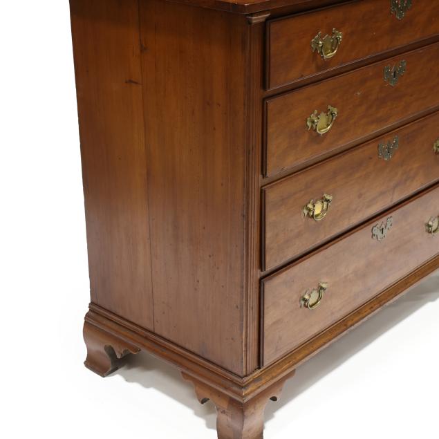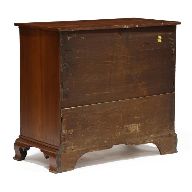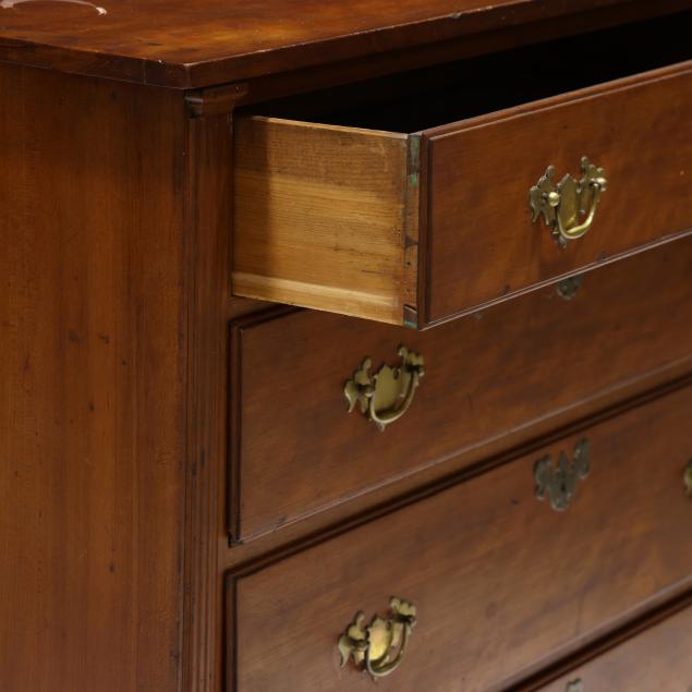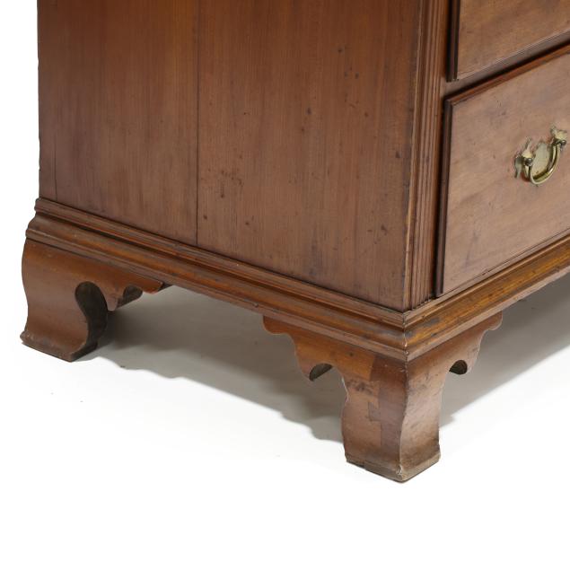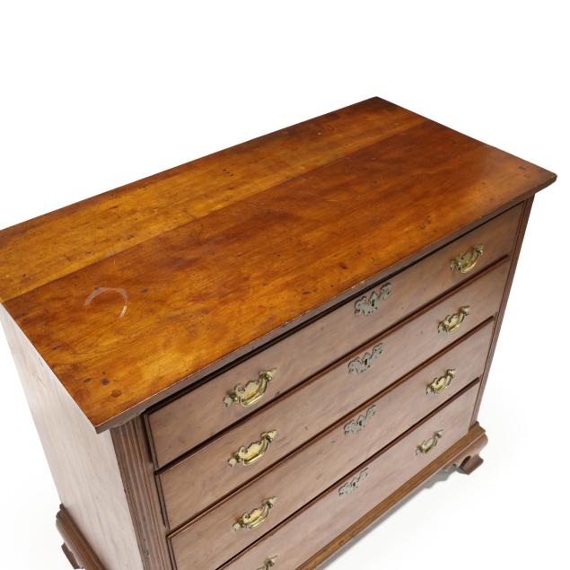 Circa 1800, white pine secondary, rectangular dovetailed case with four graduated drawer with lipped edge flanked by fluted stiles, molded baser with ogee bracket feet.