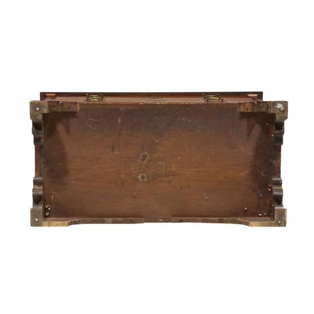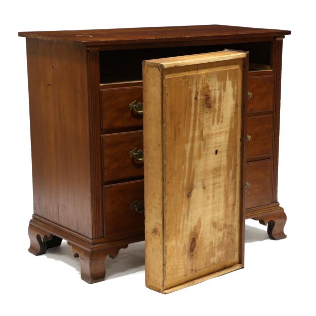 From the Estate of the late Susan C. Frankenberg, Hillsborough, North Carolina Top reset; surface scratches and staining throughout; old but later pulls; feet are old and appear original with some later screws - note the rear feet are dovetailed to the rear brackets.