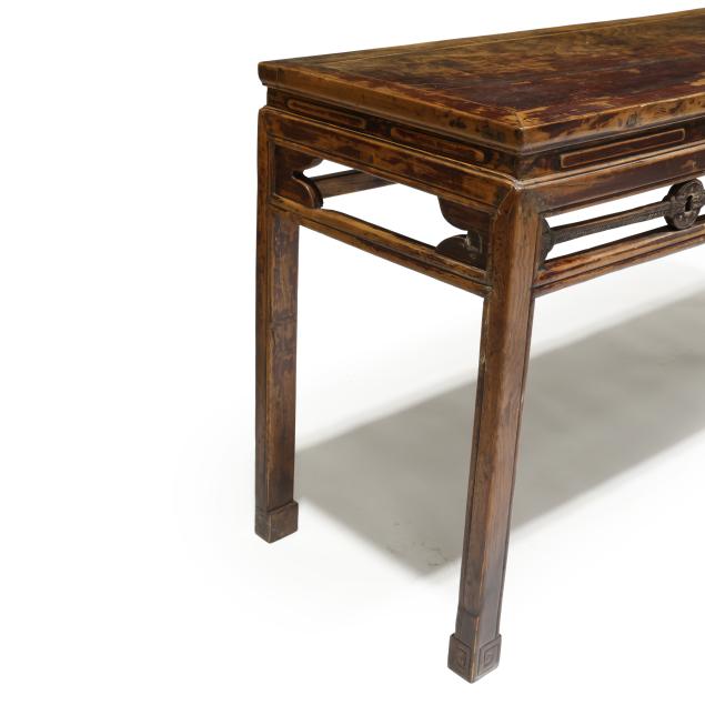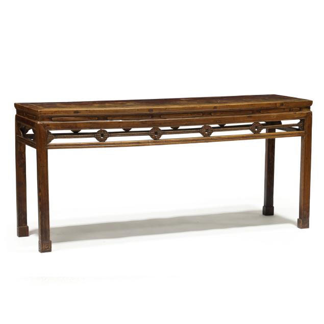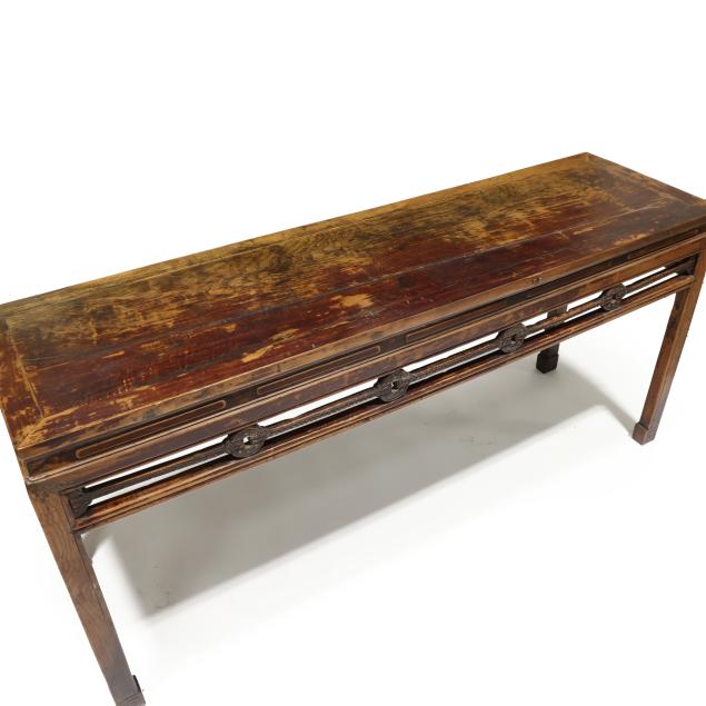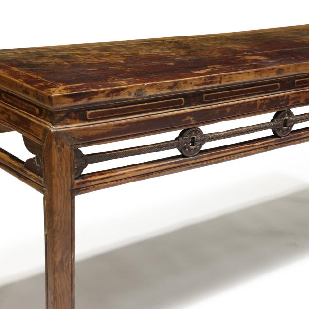 Late 19th century, red wash over hardwood, flush paneled top with through tenon joinery, raised panel frieze, the skirt with reticulated carved rope and medallion motifs to the long sides and open panels to the short sides, tall straight legs with molded edge and stylized whorl feet.