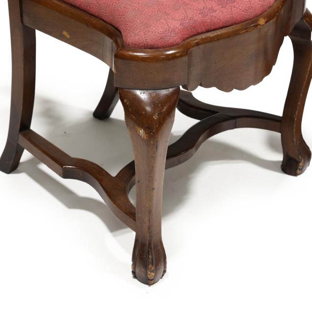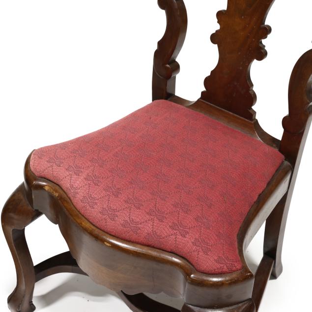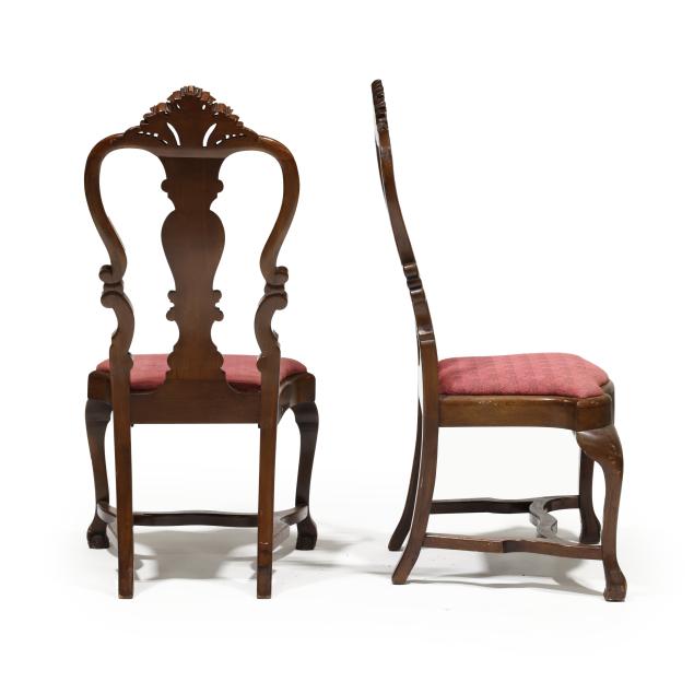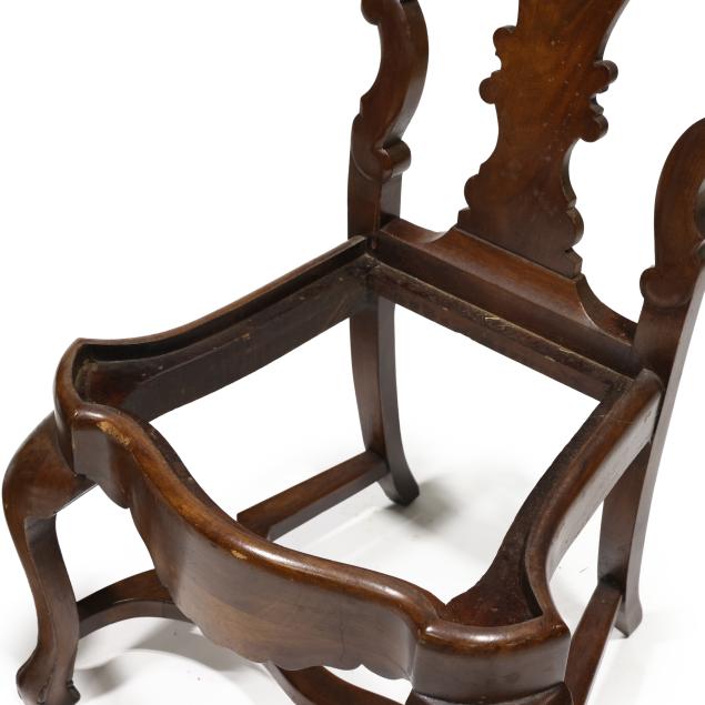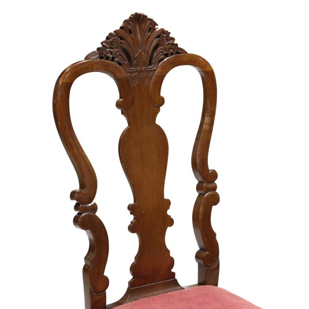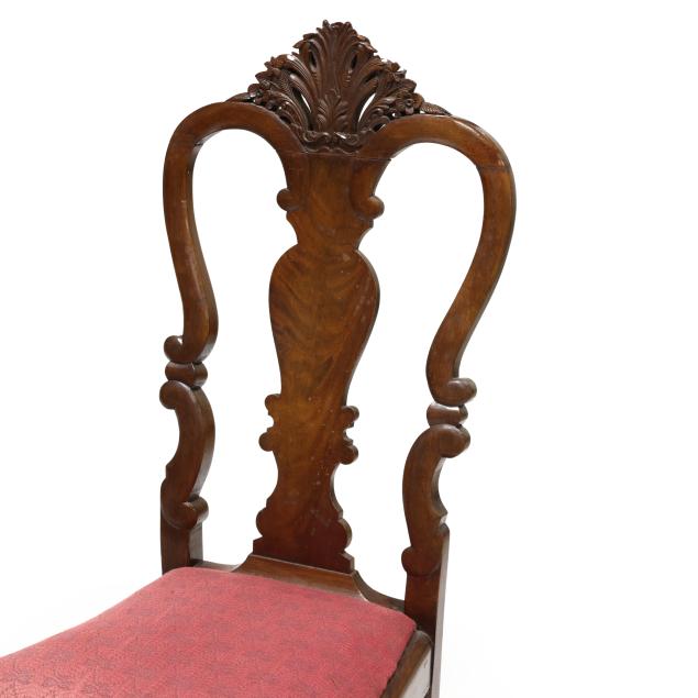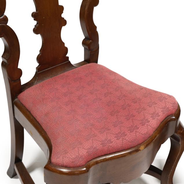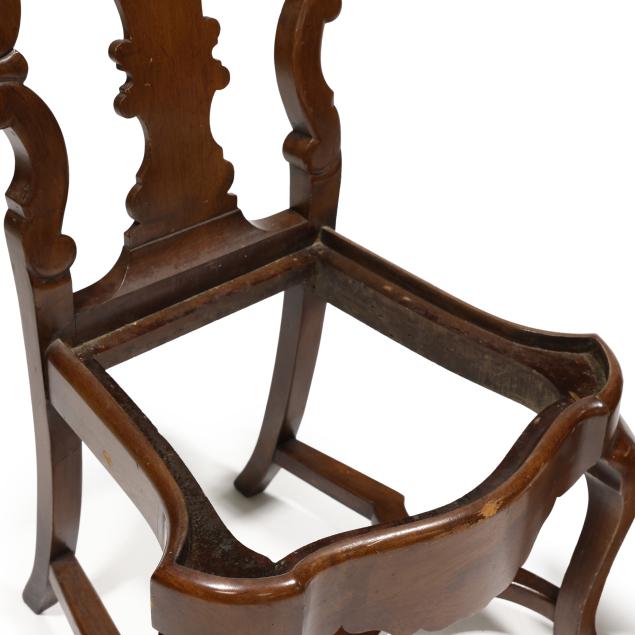 19th century, relief carved and pierced crest rails with acanthus leaf and floral motifs, vasiform back splat, shaped scroll stiles, serpentine slip seat, conforming seat rail with rounded edge, scalloped skirt, front cabriole legs on stylized ball and claw feet, shaped stretcher base.