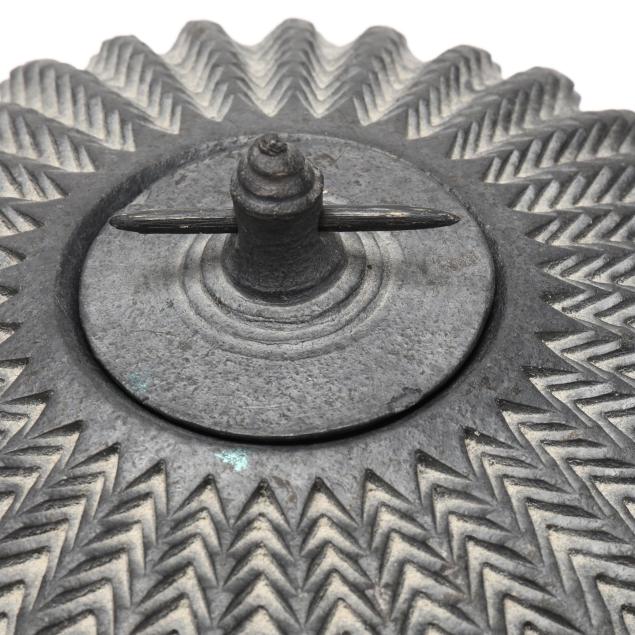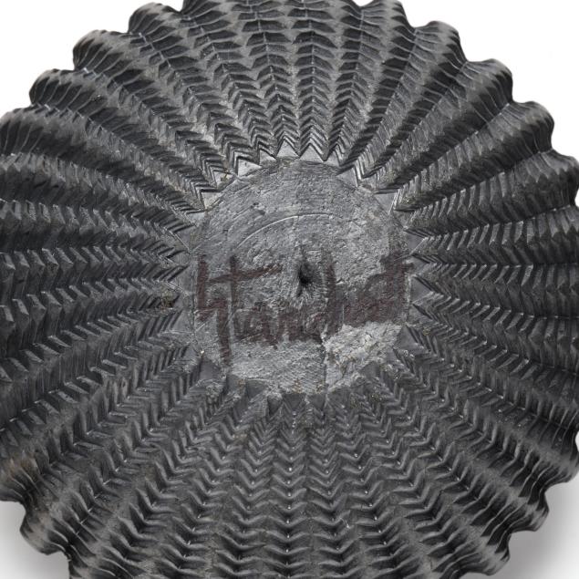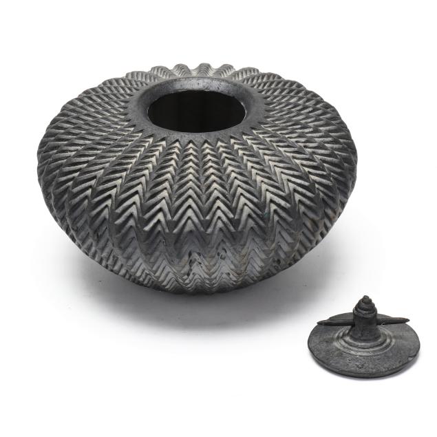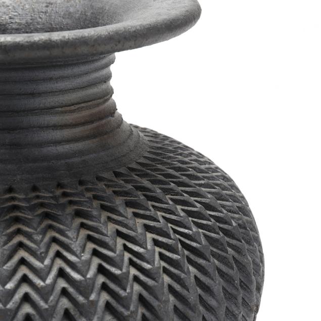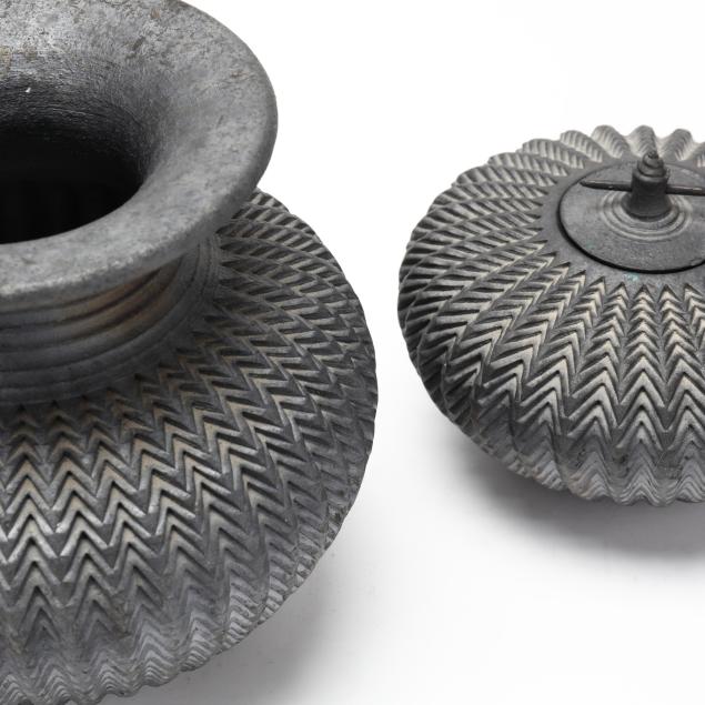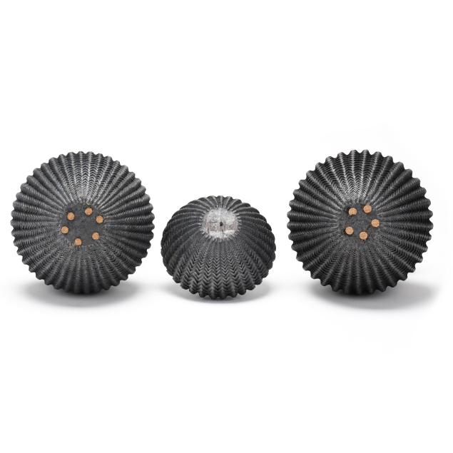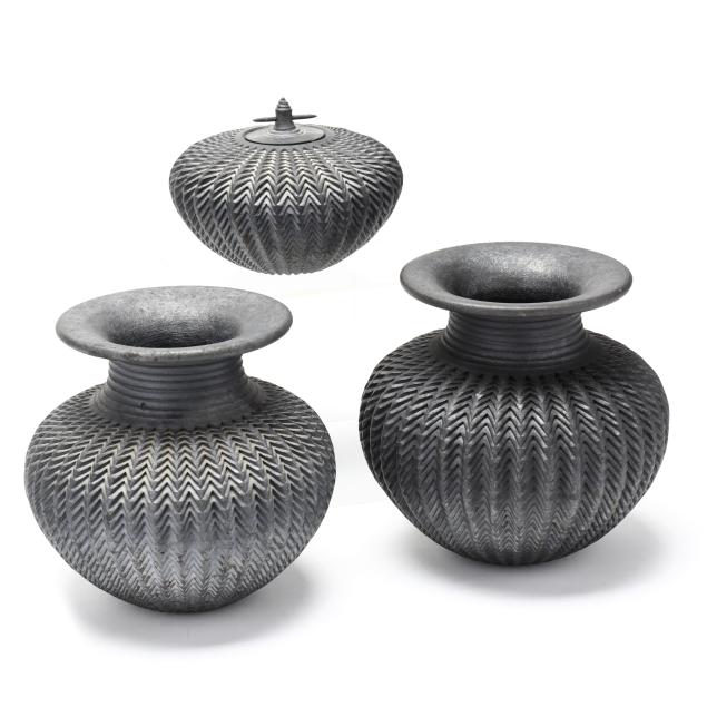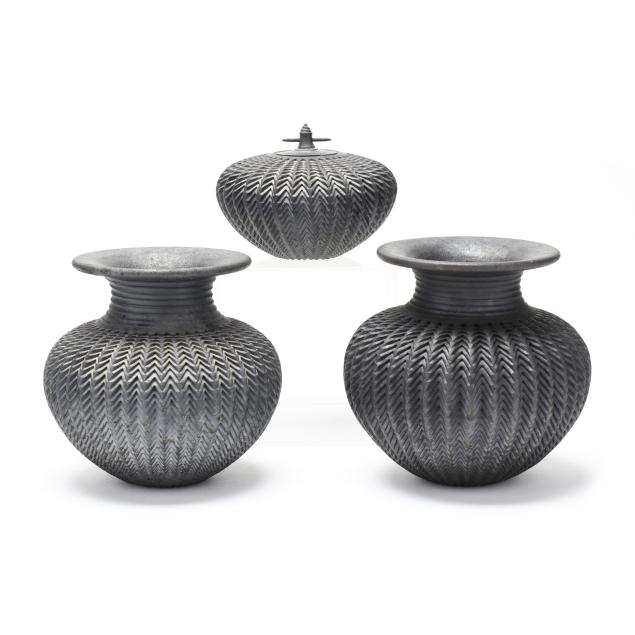 Oregon, hand indented stoneware vessels with geometric radial design in matte black finish, including a near pair of squat vases with flared rims; and a lidded squat vase, all signed "Standhardt" to underside.