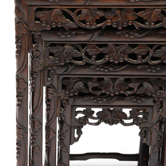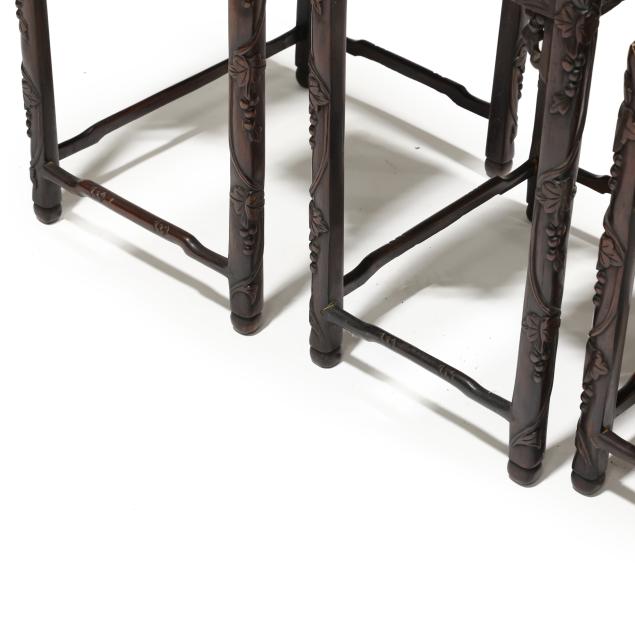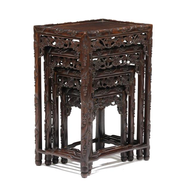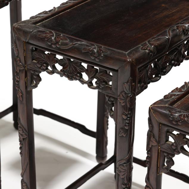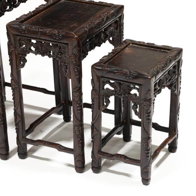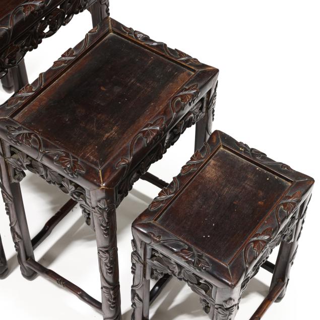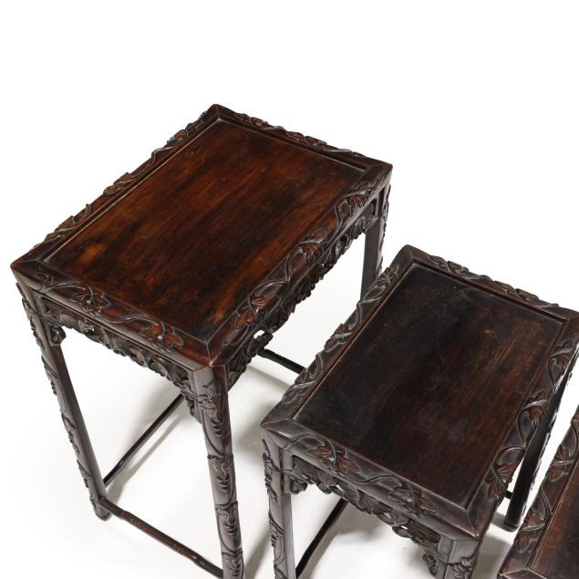 From the Estate of the late Susan C. Frankenberg, Hillsborough, North Carolina Old surface with some finish inconsistency and staining to the tops; the third smallest table with shrinkage crack to the top.