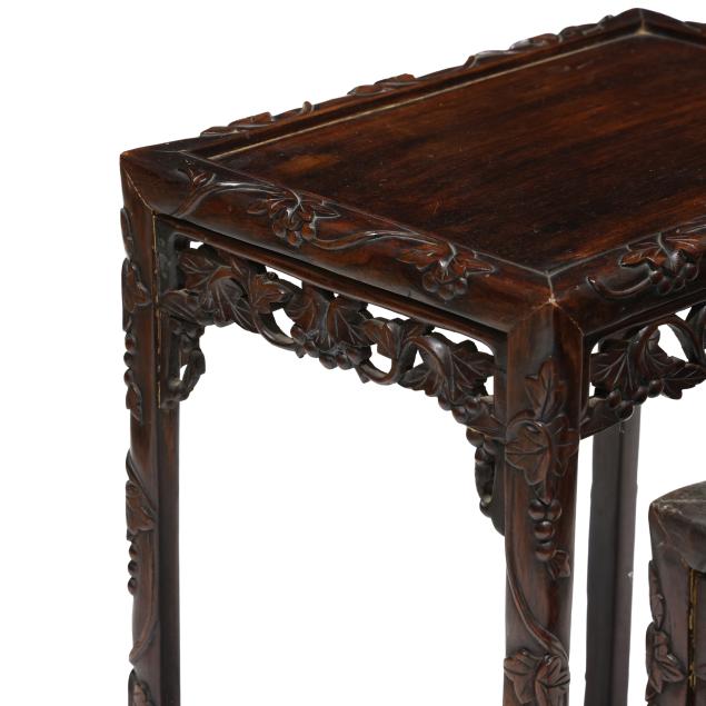 Late 19th century, possibly huanghuali, rectangular form with relief carved leaf, berry and vine, reticulated skirts on straight legs with shaped stretcher base.