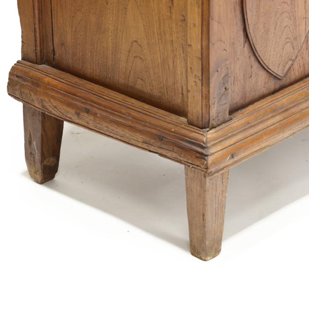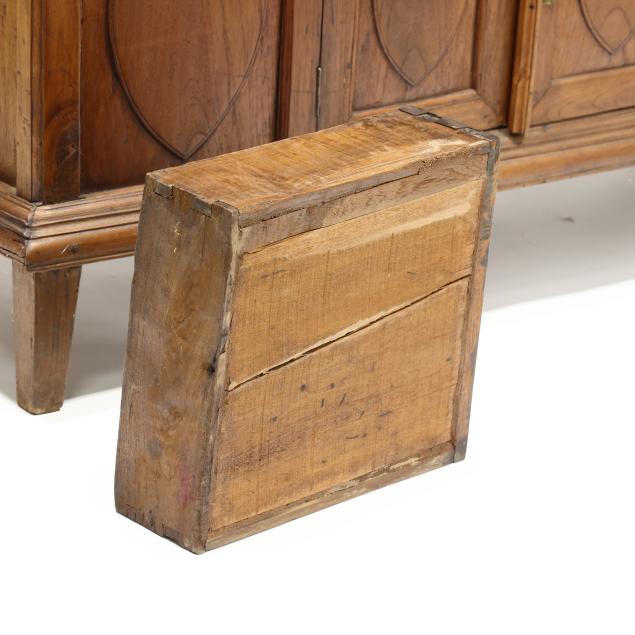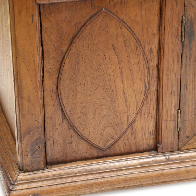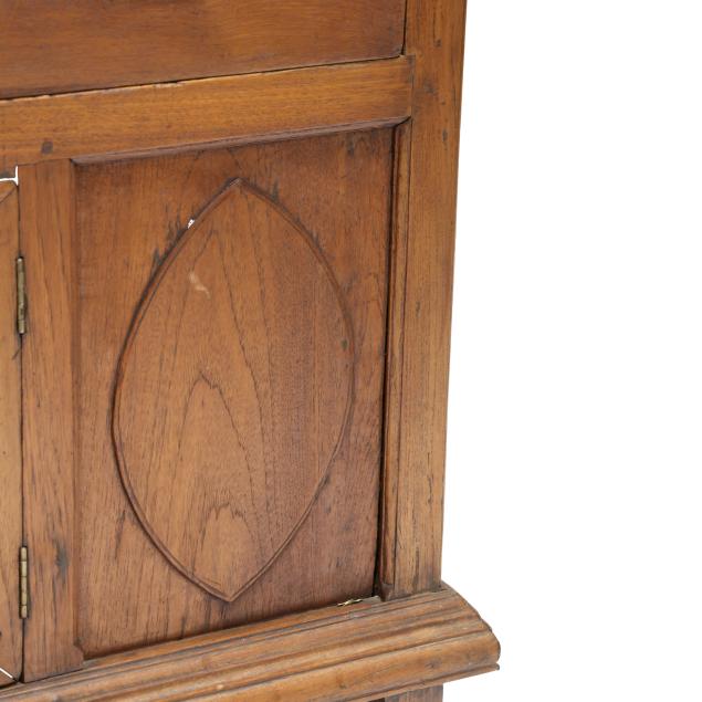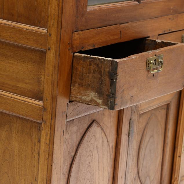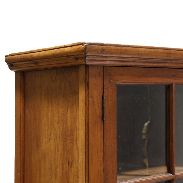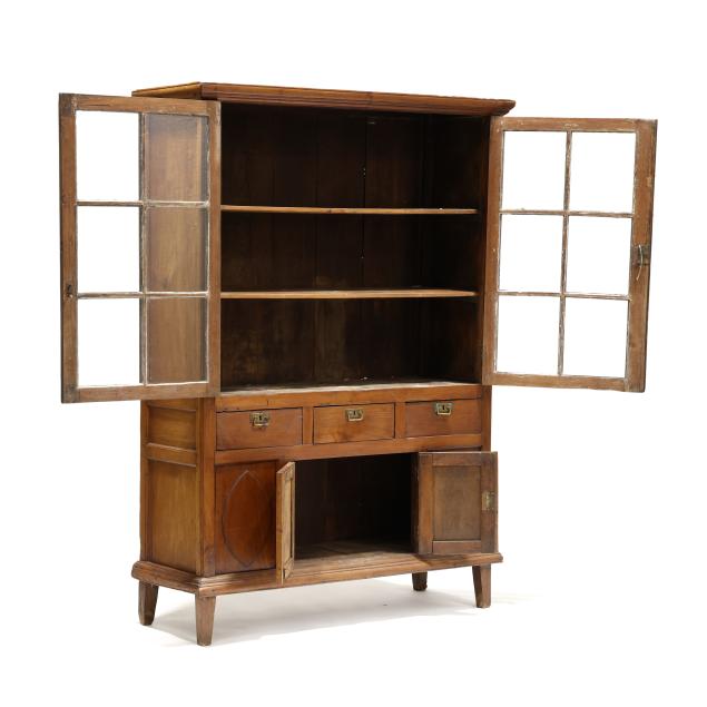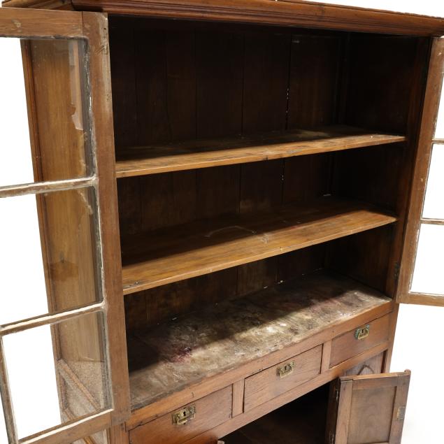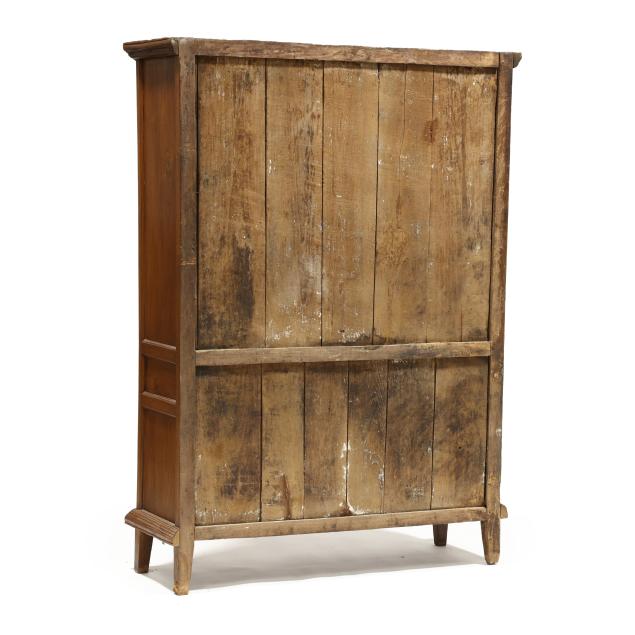 From the Estate of the late Susan C. Frankenberg, Hillsborough, North Carolina Staining to interior; cornice with edge wear; warp to upper right door (causing tightness to open/close); some later glass; later pulls; sun fading to left side of case; lower left panel with shrinkage crack.