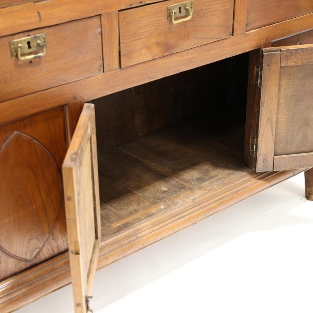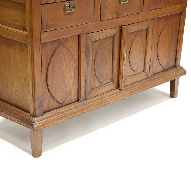 Circa 1900, one part form, molded cornice, two hinged doors with six window lights each, fixed shelf interior, three side by side drawers, two hinged lower doors and flanking panels with raised lozenge panels, paneled sides, molded base with straight legs.