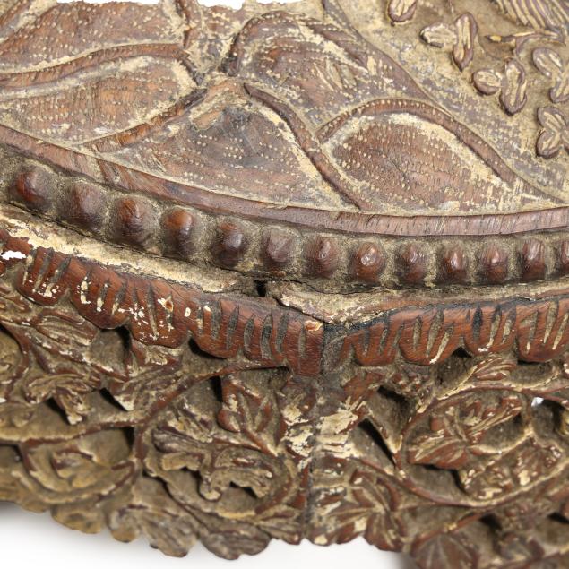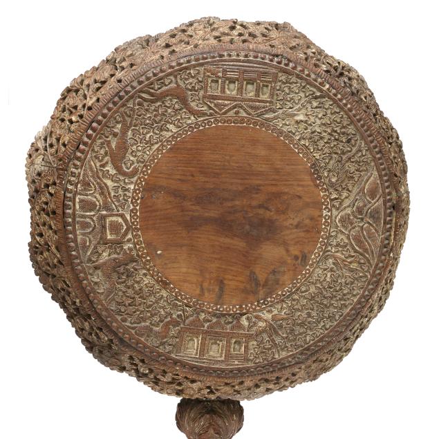 Late 19th century, appears to be teak, circular top with scalloped skirt, relief carved edge with temples, birds and mountains, the skirt with leaf and berry motif, the standard with acanthus leaf and pineapple, the quadruped base with chilong and foliate motifs.