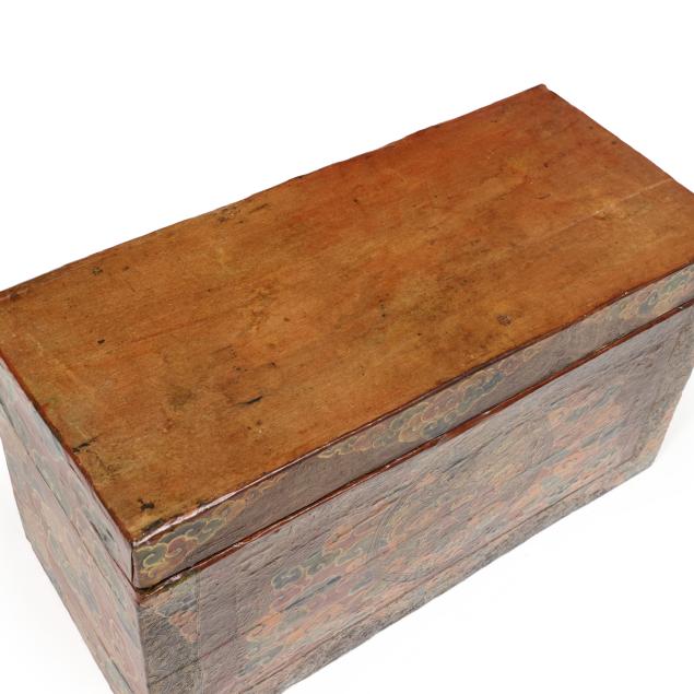 Circa 1900, canvas over wood, rectangular lid with simple ring hinge, open interior, the front with polychrome decoration of a dragon in clouds, flush base.