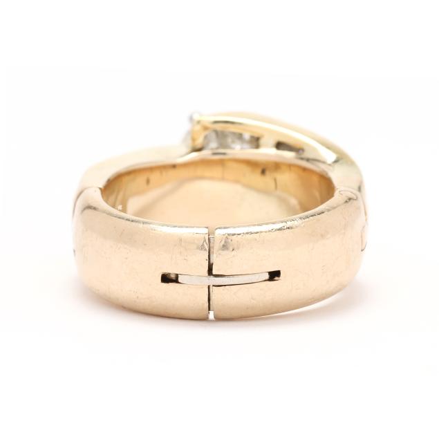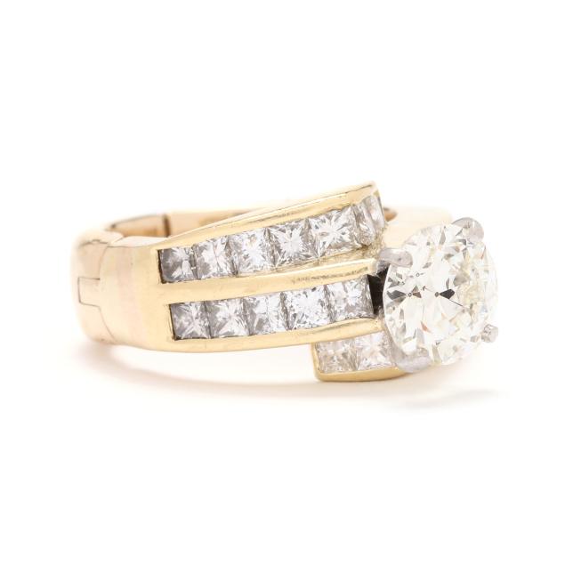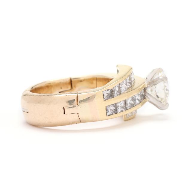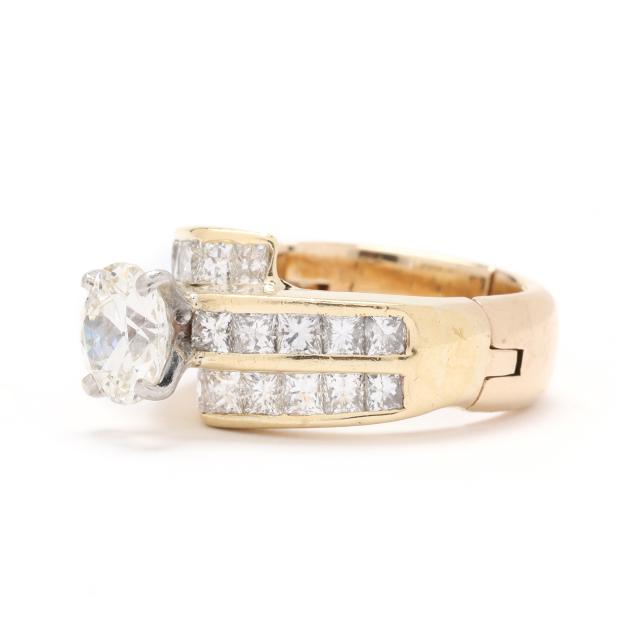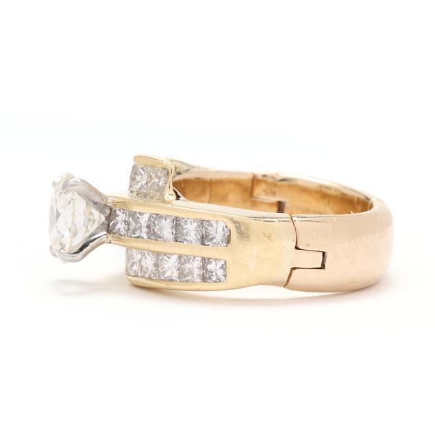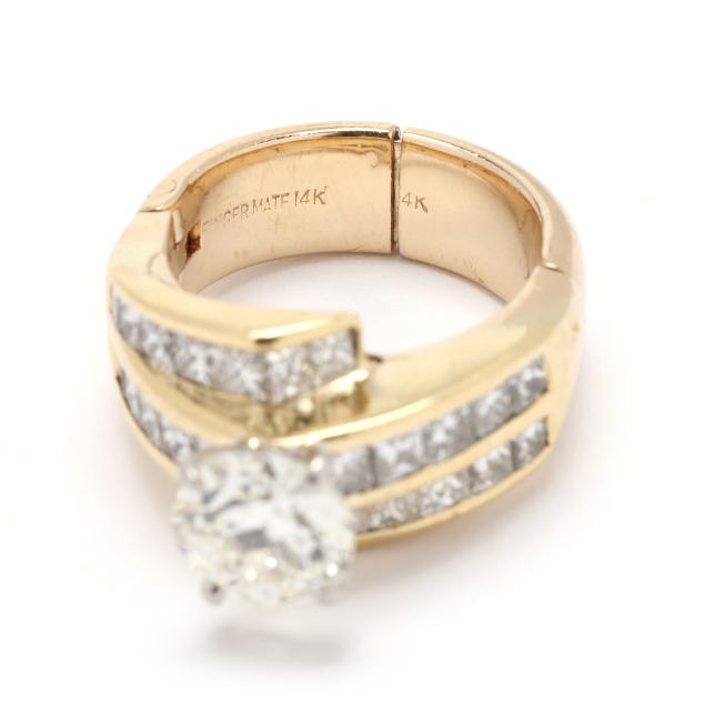 the bypass style ring, centered on a circular brilliant cut diamond (7.47 - 7.59 x 4.45mm) weighing 1.61 carats (actual) (K color, VS2 clarity), with channel set princess cut diamonds weighing approximately 1.88 total carats (I-J color, VS2-SI1 clarity) to bypass and each shoulder, completed with adjustable shank stamped Fingermate 14K.