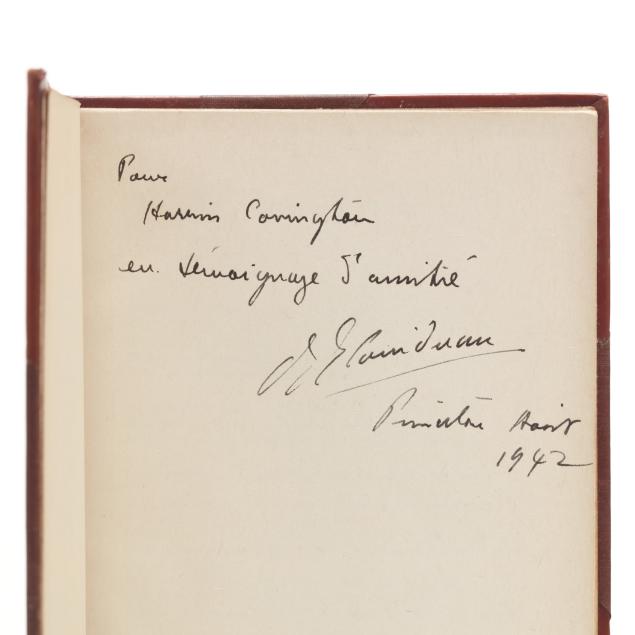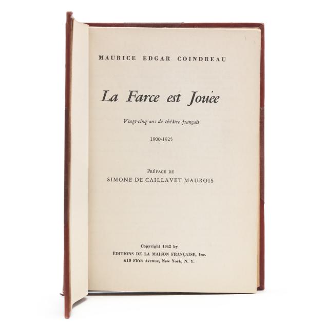 La Farce est Jouée: Vingt-cinq ans de théâtre français, 1900-1925. New York: Éditions de la Maison Français, 1942. 8vo; 306, [2]pp. Inscribed by the author on front endpaper, signed, and dated 1942.