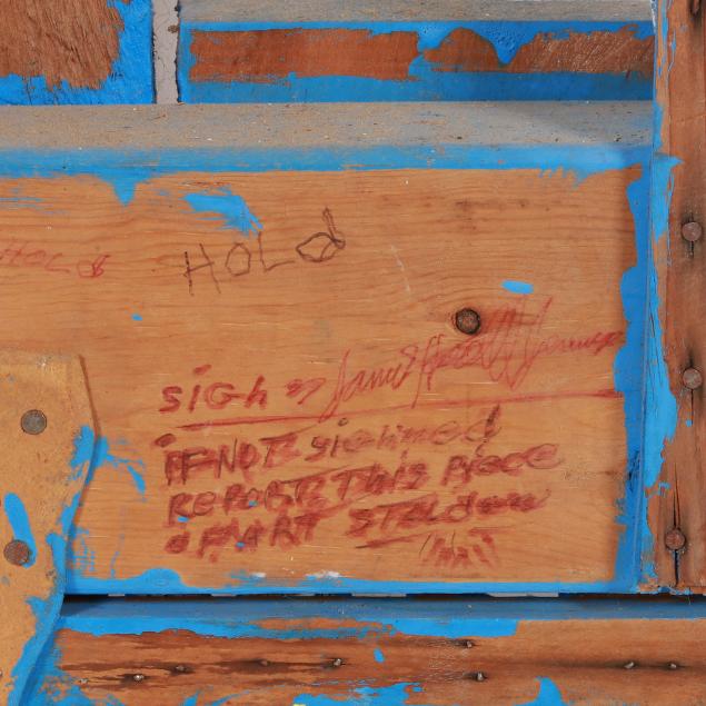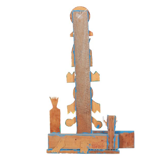 1997, polychrome painted, cut and assembled wood, labeled "James Harold Jennings" to base, signed to verso with date and "if not sighned [sic] report this piece of art stolden [sic]."