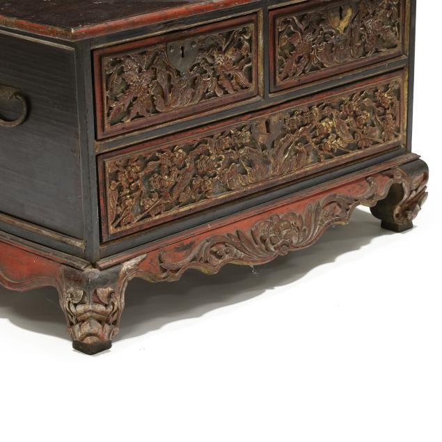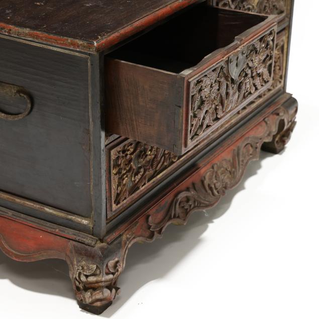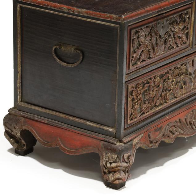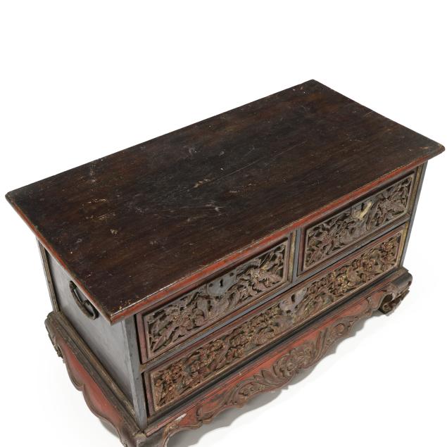 Early 20th century, hardwood possibly teak, top with molded edge, three flush drawers with intricate relief carving, paneled sides with bail handles, scalloped skirt base on stylized cabriole feet.