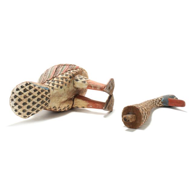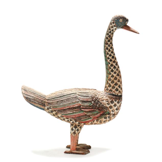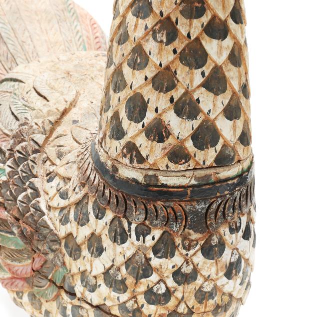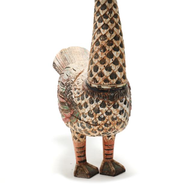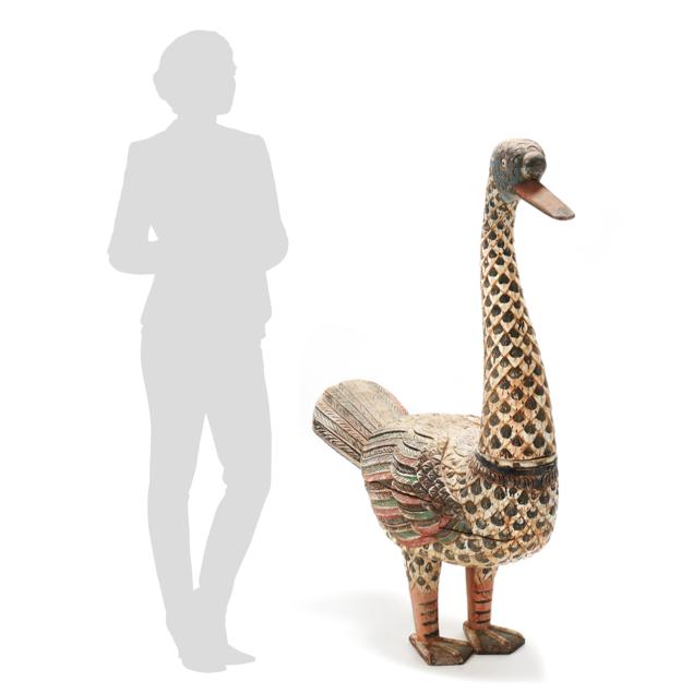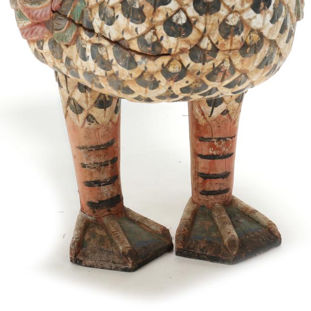 Areas of paint loss, mainly to top of bird's head and body; cracking to wood throughout.