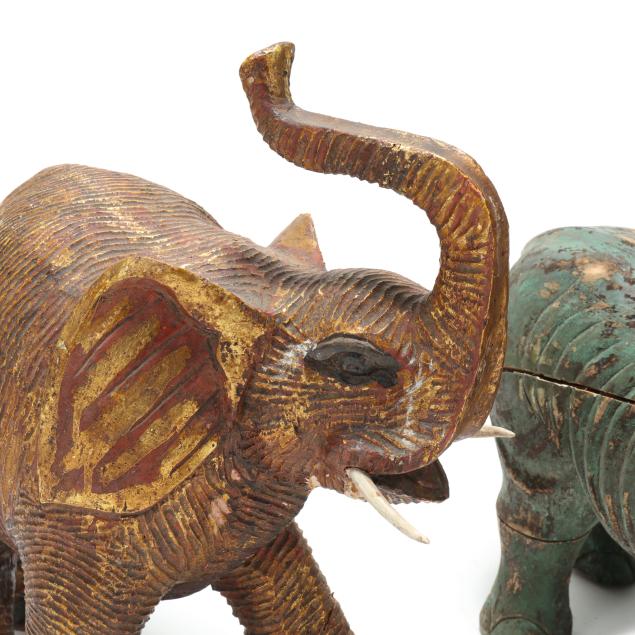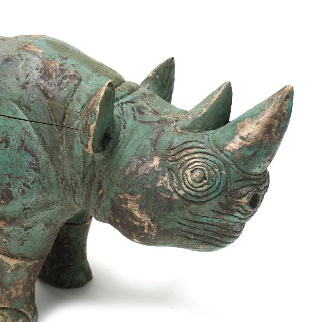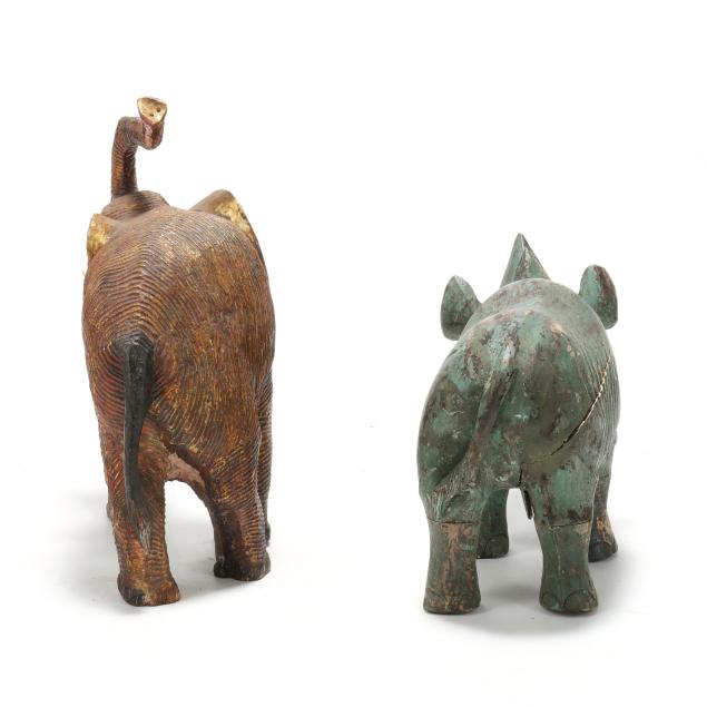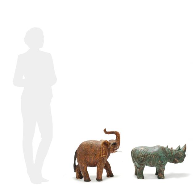 From the Estate of the late Susan C. Frankenberg, Hillsborough, North Carolina Rhino with areas of paint loss and scuffs, crack running from ear to rear leg, a few other small cracks with later paint touch up, scattered nicks to base; elephant with break and repair to front left leg, crack to left ear, scattered small surface scuffs.