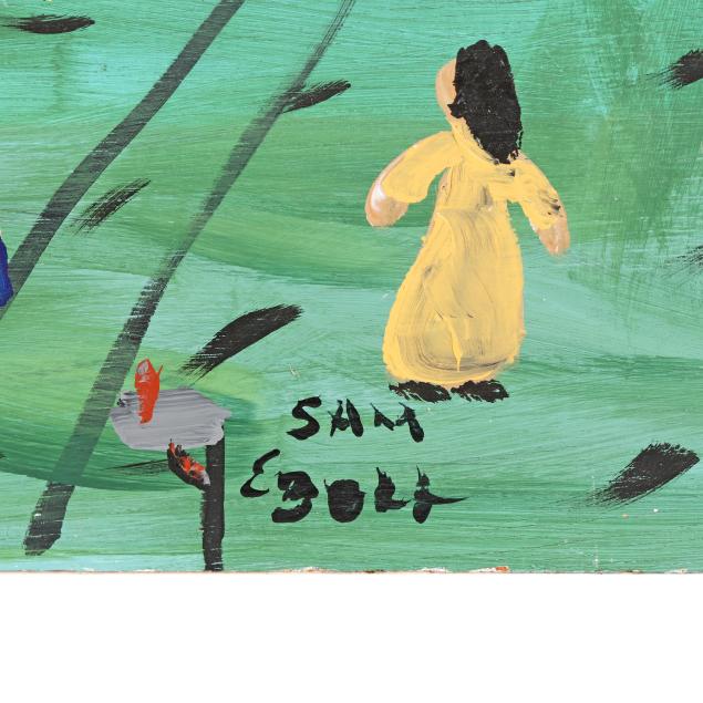 From the Estate of the late Susan C. Frankenberg, Hillsborough, North Carolina Folk and “Outsider” artist Sam Ezell has become a force in the local arts communities of Durham and Orange Counties, as well as the surrounding areas. He took up painting in 2008 when an artist friend requested he create something for her, and since then the demand for his colorful, bold works keeps growing.
