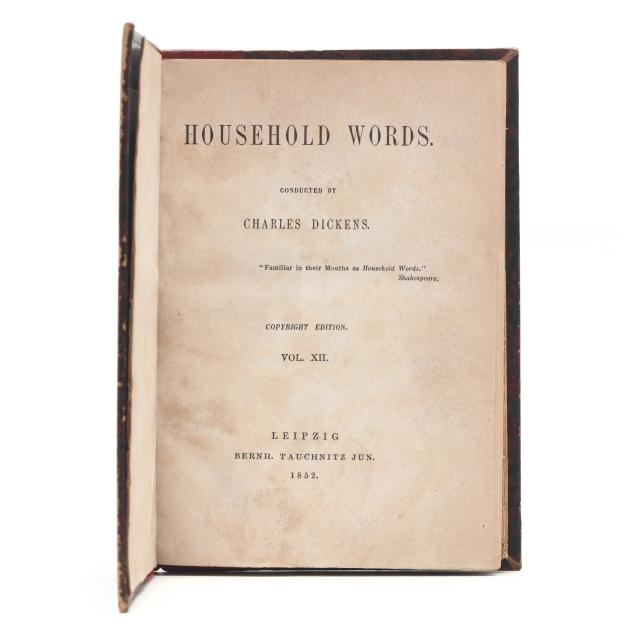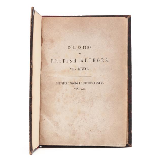 With: (3) volumes by Charles Dickens, to include: Household Words (vol. 11, 1852; vol. 21, 1853; and vol. 34, 1856); (2) volumes by Bret Harte, to include: Prose and Poetry (vol. I, 1872) and The Story of a Mine (1877); (5) volumes by Wilkie Collins, to include: No Name (vol. I, 1863), Man and Wife (vol. I, 1870), Poor Miss Finch (vol. II, 1872), Jezebel's Daughter (vol. I, 1880), and "I Say No" (vol. I, 1884); (2) volumes by Charles Reade, to include The Wandering Heir: A Matter of Fact Romance (1875) and Peg Woffington (1872); (2) volumes by Rosa Nouchette Carey, to include: Not Like Other Girls (vol. I, 1891) and Herb of Grace (vol. I, 1901); F. Marion Crawford's Marzio's Crucifix (1887); and Ernest William Hornung's Under Two Skies: A Collection of Stories (1892).